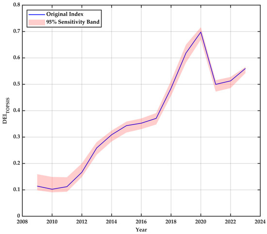 For each year, the 95% sensitivity band is obtained from the empirical 2.5th and 97.5th percentiles of the B simulated index values. For every perturbed dataset, the full pipeline is re-run times—min–max normalisation, entropy-weight calculation, TOPSIS scoring, and weighted-cumulative SPOTIS scoring—using a fixed random seed for reproducibility. Two variants are considered: (i) recomputing entropy weights in each replication to assess weight sensitivity; and (ii) holding the baseline weights fixed to isolate the robustness of the scoring models. Unless otherwise stated, figures report the fixed-weight variant. The chosen B yields stable percentile estimates; larger values produced indistinguishable bands in practice. Because and in all replications, each composite index remains within , ensuring strict comparability with the baseline series. COMSAM thus evaluates robustness to local perturbations in measured indicators and complements the inferential checks in Section 3.3.2 and Section 3.3.3.