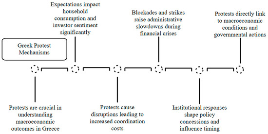 To move beyond chronology (see Figure 1), we adopt a formal interpretive framework that ties Greek protest waves to macro-outcomes via expectations, disruption, and institutional feedback, replacing narrative detail with mechanism-based interpretation and ending with testable propositions. This research answers how social movements during Greece’s crisis (2010–2015) shape macroeconomic dynamics and policy sequencing, and through which mechanisms? We investigate three channels: (i) expectations and confidence (household consumption, investor sentiment), (ii) disruption and coordination costs (strikes, blockades, administrative slowdowns), and (iii) institutional feedback (policy concessions, timing, and credibility). The objective is interpretive and theory-driven, not causal estimation: we map mechanisms and scope conditions that future empirical work can test. Greece serves as a critical case where austerity, mass mobilization, and institutional stress coincided, making it suitable for a literature-based, conceptual analysis.