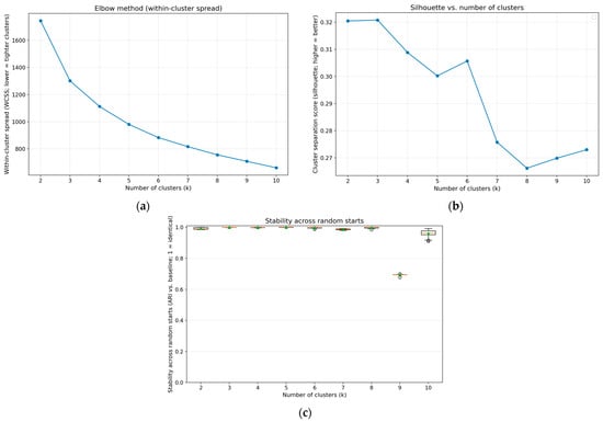 Multiple criteria were applied for diagnostic evaluation of robustness and for selection of the cluster number. The elbow method was used to examine within cluster variance across candidate values of cluster size K, and silhouette scores were used to assess cohesion and separation. Multiple random initializations were performed, and the solution with the lowest within cluster sum of squares was retained. In addition, cluster stability was evaluated using the adjusted Rand index (ARI) across repeated initializations and repeated runs. Together, these diagnostics were used to support the retained K choice and to confirm that partitions were well distinguished and stable. For diagnostic evaluation, K was screened over K = 2 to 10.