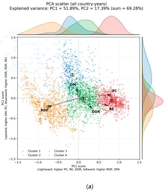 We applied principal component analysis (PCA) to the scaled panel dataset for visualizing the five-lens clustering results. PCA served only as a visualization aid, projecting high-dimensional data onto two principal axes. We retained the first two components (PC1 and PC2), which capture most variance in lens scores, and report their explained variance ratios. This projection enables two-dimensional plots showing cluster archetypes and temporal migration paths, while maintaining comparability of clusters in the original five-lens space.