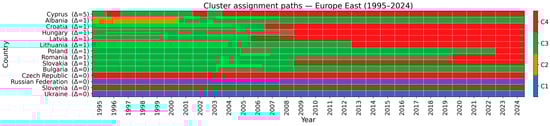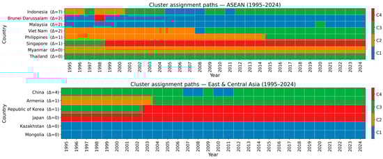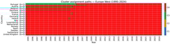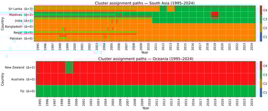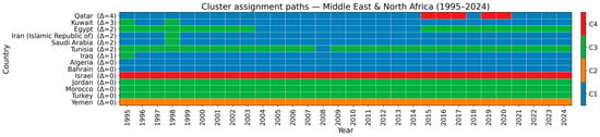 This subsection provides a system view of how countries navigate capability space over 1995–2024, linked to four archetypes. RQ1 is addressed by tracking archetype persistence through cluster shares and centroid paths. RQ3 is addressed by summarizing mobility using transition probabilities, permanence (no move back for five years), and boundary reversals, with regional context. These temporal diagnostics, alongside fairness results, clarify whether change arises from tightening within clusters or reallocation across clusters.