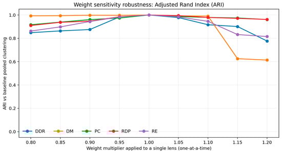 Cluster size sensitivity under one at a time lens reweighting. For each lens, the pooled k-means partition was re estimated after applying a weight multiplier in the range 0.8 to 1.2 to that lens only.