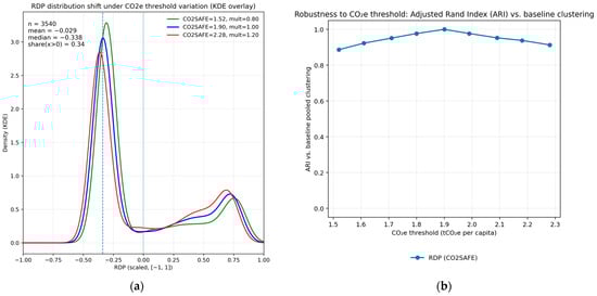 RDP was operationalized as an environmental headroom lens: country–year conditions were compared against benchmarks to assess safe room for development versus environmental cost risks. The benchmark focuses on per capita CO2 emissions, following literature emphasizing carbon budget as the critical constraint for intergenerational sustainability. A threshold of 1.9 tCO2e per person per year was adopted as a Paris-consistent reference under equitable sharing of the 1.5 °C carbon budget (Chancel, 2022; IPCC, 2022). The headroom function captures whether countries operate within this per capita limit, with values declining toward zero as emissions exceed the benchmark.