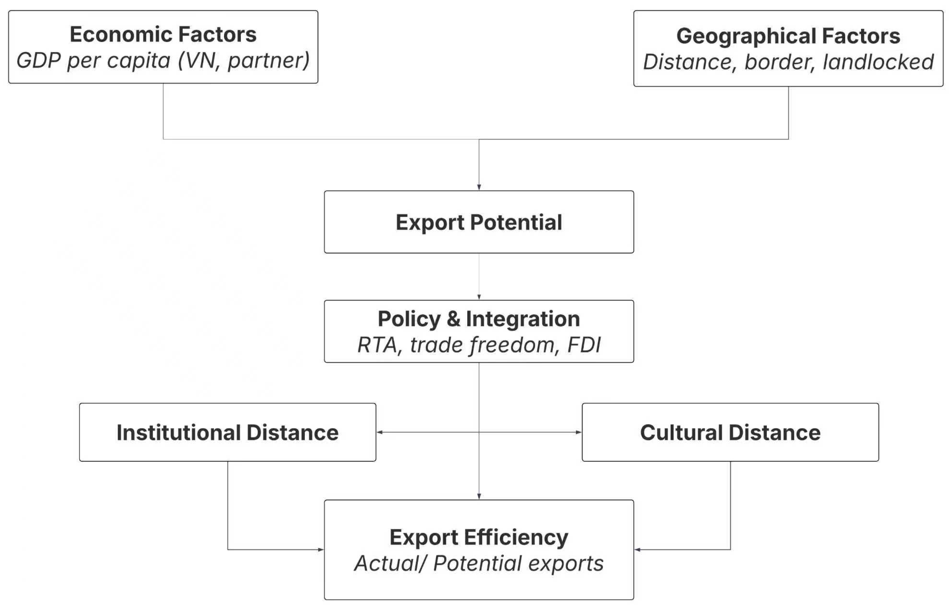 | BORDER | Dummy | 1 = shares a land border with Vietnam; 0 = otherwise | CEPII GeoDist |