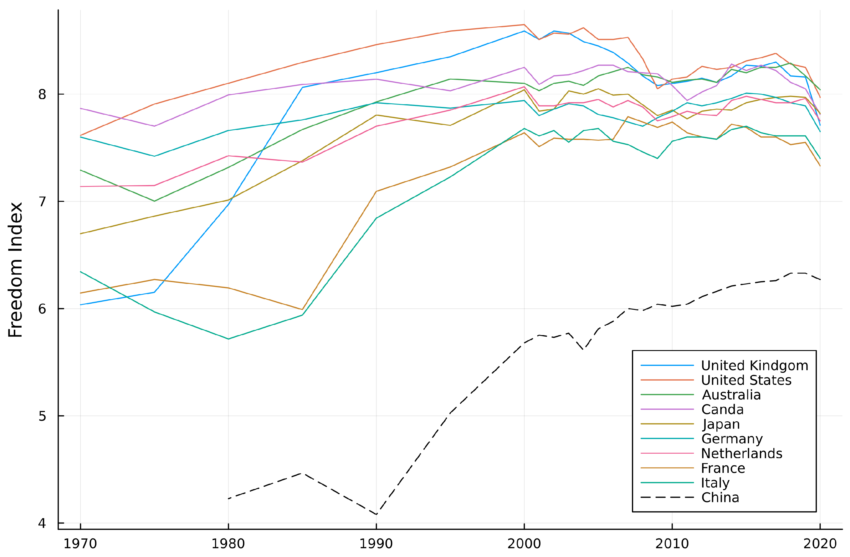 Figure 1. Throughout the sample period, China exhibits lower levels of measured economic freedom relative to the democratic economies considered. The available data indicate that the increase in China’s economic freedom begins later than in the democratic sample but follows a sustained upward trajectory through 2020. Over the same period, China records high rates of economic growth, followed by a more recent moderation in both growth and economic freedom. Taken together, the descriptive evidence suggests that economic freedom in democratic economies reached relatively high levels around the year 2000 and subsequently declined, whereas China, starting from a lower initial level, experienced a pronounced increase in economic freedom up to 2020.