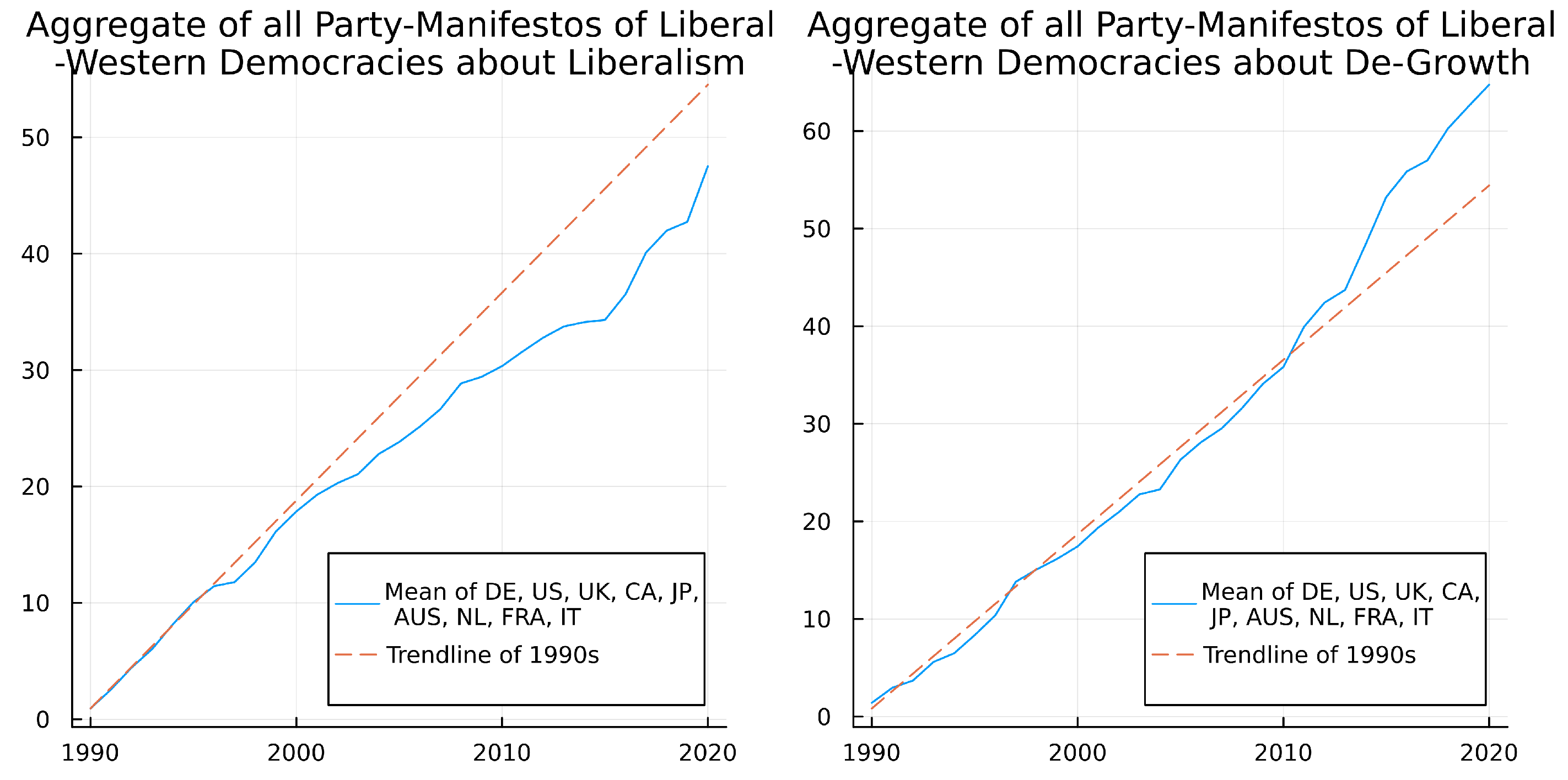 Overall, the analysis highlights distinct temporal patterns in the evolution of economic freedom between democratic economies and China. The decomposition indicates that the average level of economic freedom in democratic economies has remained relatively stable or slightly below long-term trends over the past two decades. In contrast, the data for China show a continued upward movement in economic freedom until recent years, although observed levels remain lower than those in the democratic sample. When considered alongside the manifesto data, these patterns correspond with a gradual decline in references to liberalism and an increase in references to de-growth within major democracies. In China, the data indicate a sustained increase in economic freedom over the same period, coinciding with the implementation of the opening-up policy doctrine.
