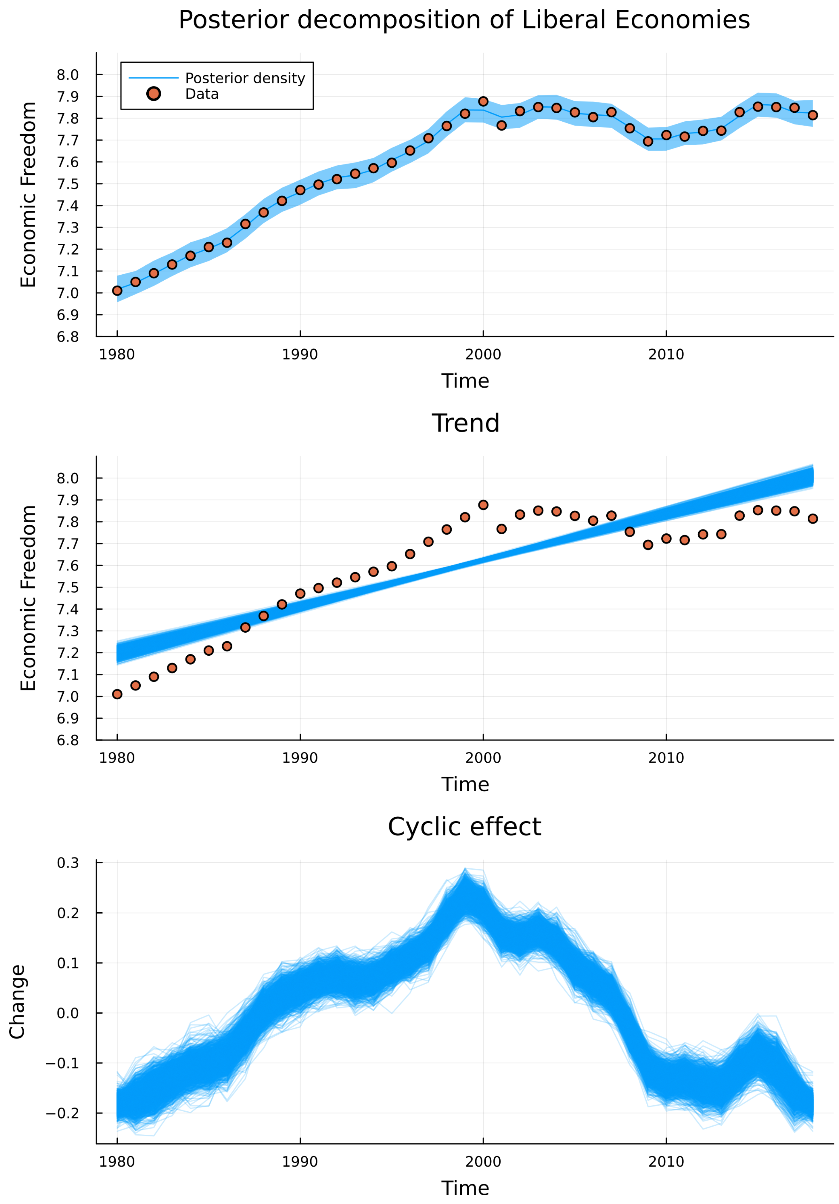 , which is comparable to levels observed in the 1980s. Taken together, the Bayesian decomposition documents a shift in the relative position of economic freedom around its long-term trend in democratic economies around the early 2000s.