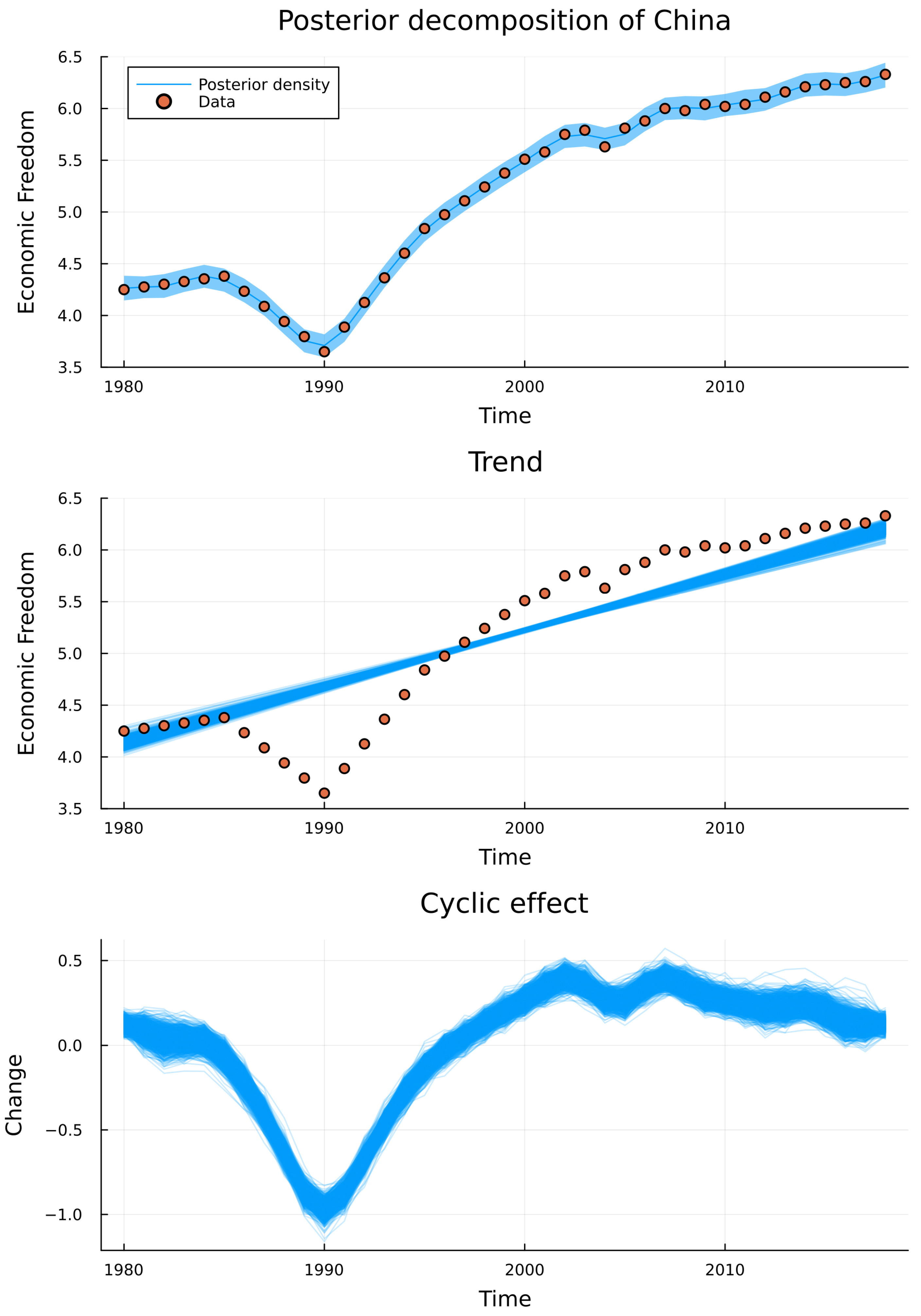 Figure 4 presents the corresponding decomposition for China. The top panel shows the observed data alongside the posterior density, indicating a sustained increase in economic freedom beginning in the 1990s. The middle panel reports the estimated trend component, which displays a persistent upward trajectory, with observed values remaining above the long-term trend for much of the post-2000 period. The bottom panel depicts the cyclical component, which exhibits a relatively stable pattern with modest fluctuations and a tentative moderation in recent years. Over most of the sample period, cyclical values remain positive, typically within a range of approximately