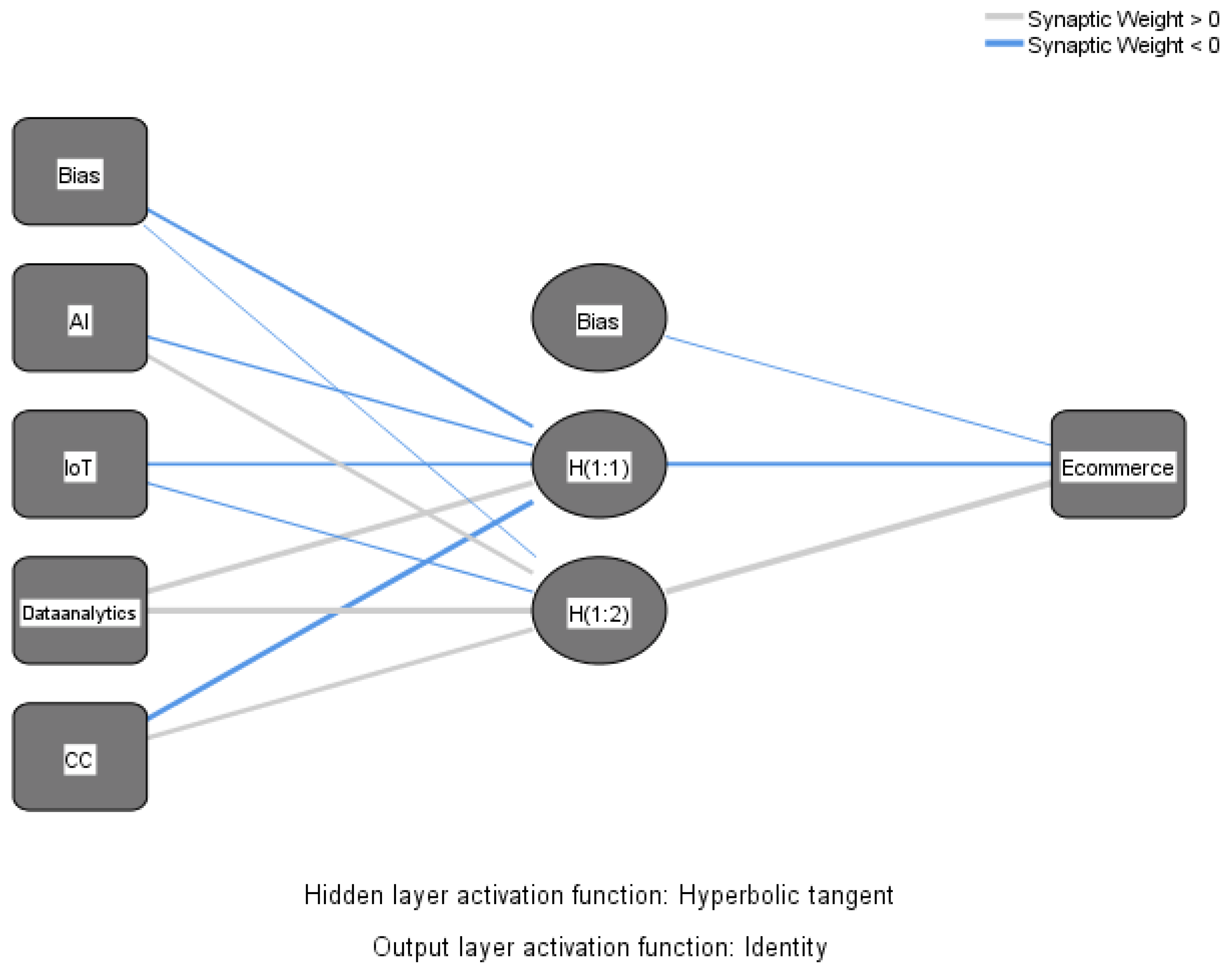Khrais, 2020). The next step in analyzing hypothesis H1 was to perform an artificial neural network analysis in order to identify networks established between variables. After running SPSS, a robust relationship was revealed between digital technologies and e-commerce. With hypothesis H1 being validated, it can be concluded that the digitization process has a beneficial effect on e-commerce, which continues to be the success formula for organizations focused on online transactions. However, electronic commerce should not be analyzed solely from the perspective of financial transactions. It involves various non-financial interactions (