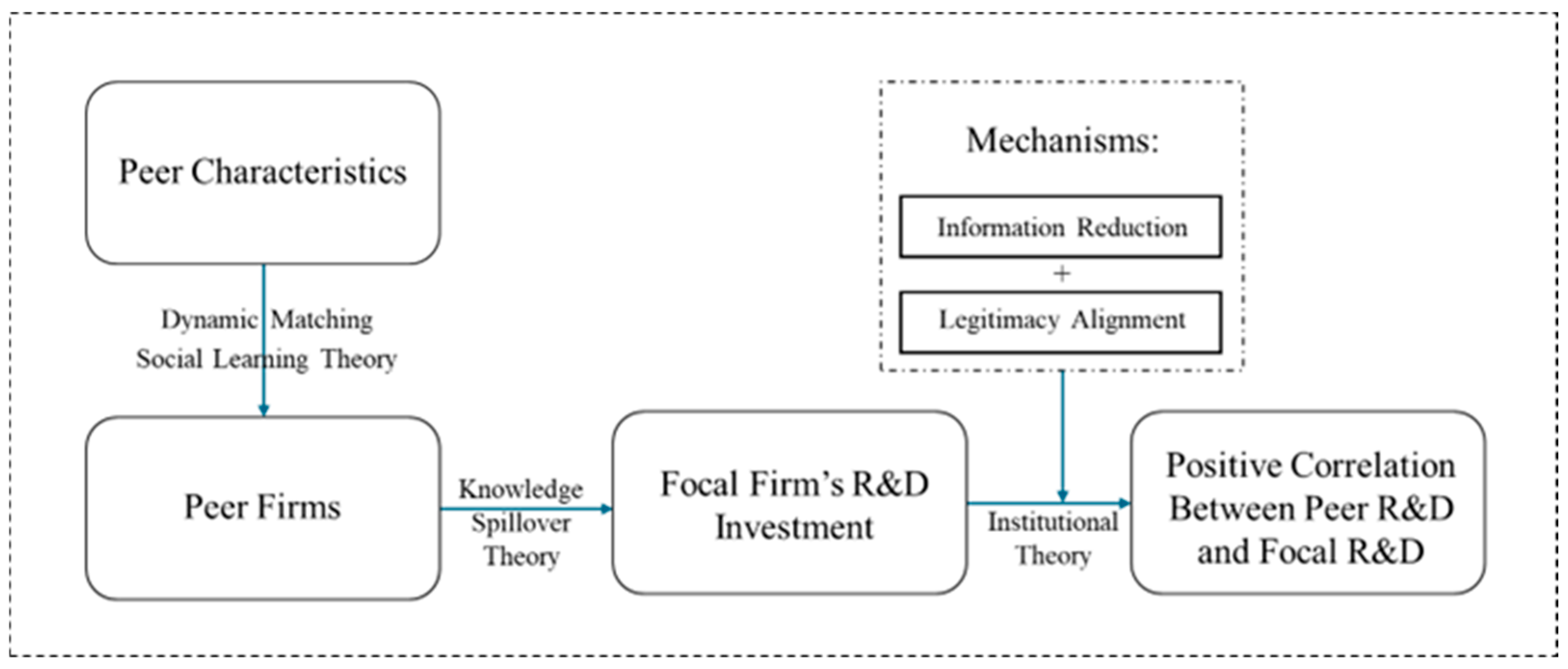 Figure 1) illustrates the influence of peer firms on the R&D investment of focal firms. First, the characteristics of peer firms, such as industry, scale, and property rights, determine the specific group of peer firms through dynamic matching based on the Dynamic Matching Social Learning Theory. Second, these peer firms directly affect the R&D investment of focal firms through the knowledge spillover theory. Meanwhile, based on institutional theory, the dual mechanisms of “information reduction (reducing information asymmetry)” and “legitimacy alignment (aligning with industry legitimacy expectations)” further act on the R&D investment of focal firms.
