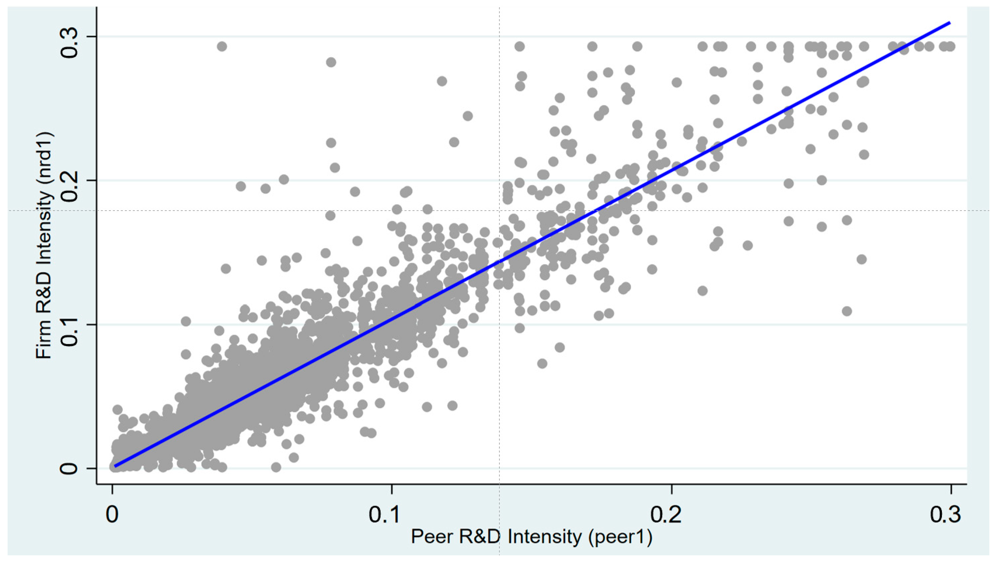 R&D investment of Chinese firms is characterized by high risks, long cycles, and uncertain returns. Particularly during the stage of economic transformation toward high-quality development, firms face relatively high information costs and decision-making risks when formulating independent R&D strategies. From the perspective of social learning, the R&D behaviors of peer firms (matched by industry, scale, and ownership nature) can provide reliable informational references for focal firms, helping them reduce uncertainty in judging technological trends and market demands, and further imitate a reasonable level of R&D input. From the lens of Knowledge Spillover Theory, R&D activities of peer firms generate knowledge externalities through channels such as talent mobility and technological exchanges. Focal firms can absorb this spilled knowledge to lower their own marginal costs of R&D, thereby enhancing the feasibility of R&D investment. Grounded in Institutional Theory, the government’s innovation policy orientation and industry competition norms create institutional pressure. By aligning their behaviors with the R&D activities of peer firms, focal firms can obtain legitimate resources such as policy support and market trust, which strengthens the rationality of their R&D investment.