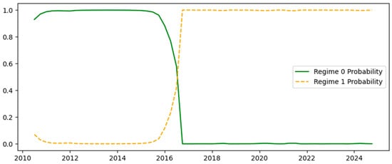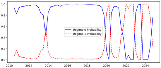 The regime evolves according to a discrete-time Markov process with transition probabilities (). We employ constant transition probabilities rather than time-varying ones, as the inclusion of the “crisis dummy” in the structural equation sufficiently captures the external drivers of regime shifts.