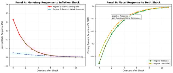 It is critical to interpret the nature of the identified fiscal regimes carefully. As Table 3 shows, the reaction coefficient to debt is statistically insignificant in both regimes, indicating a structural persistence of Non-Ricardian behavior throughout the sample. Consequently, the MS-VAR identifies the regime switch primarily through the error variance rather than a change in the systematic reaction function. The shift from Regime 0 to Regime 1 is not a transition from “passive” to “active” fiscal consolidation, but rather a transition from “stable fiscal dominance” to “volatile fiscal dominance” . This suggests that during crisis periods, the fiscal authority did not alter its structural relationship with debt, but rather engaged in large, discretionary spending swings that were uncorrelated with the stabilization mandates, thereby increasing the noise introduced into the macroeconomic system.