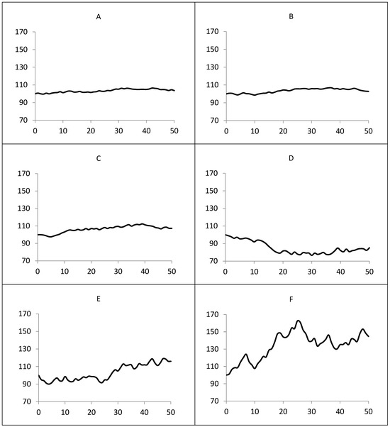 Simulated Time Series with Increasing Volatility. (A) shows the lowest-volatility series, characterized by smooth and gradual movements. (B) displays a low-to-moderate volatility series with mild fluctuations. (C) represents a moderate-volatility series with more noticeable variability across periods. (D) illustrates a high-volatility series, marked by large and frequent swings. (E) shows a very high-volatility series with pronounced and irregular fluctuations. (F) represents the highest-volatility series, exhibiting large and erratic swings from one period to the next. All series contain the same number of observations, start from the same initial value, and share an identical vertical scale.