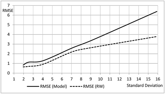 The results convey a message that is intuitive once stated clearly. As volatility increases, the underlying process becomes harder to predict, regardless of how well specified a model may be. Forecast errors grow not because the model suddenly becomes misspecified, but because the data themselves become more erratic. In this sense, forecasting accuracy deteriorates naturally as volatility rises. For a given model, higher volatility translates mechanically into a higher root mean square error. The same logic applies to the random walk benchmark, whose forecast error simply reflects the magnitude of changes in the series.