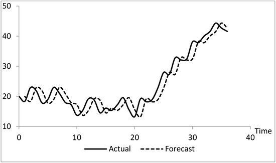 Figure 3 makes this intuition concrete. It plots a simulated time series and the corresponding forecasts generated by a simple random walk with no drift, with the horizontal axis representing time and the vertical axis measuring the value of the series. The forecasts closely trail the realized values, creating the appearance that the model is accurately predicting future movements. But the direction of causality is revealing. The forecasts are not leading the series forward; they are being pulled along by what has already happened. The actual values are doing the leading, and the forecasts are merely following.