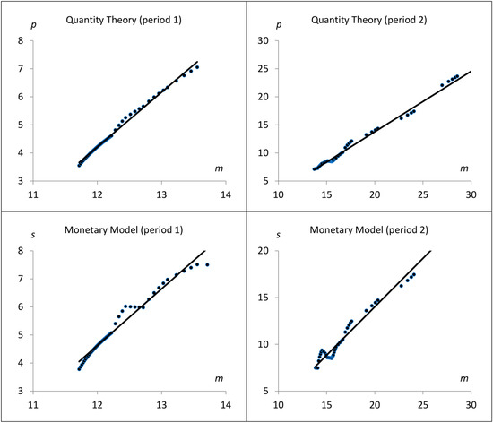 The acceleration of inflation in 1923 leads the analysis to be conducted by dividing the sample period into two periods. Period 1 encompasses December 1921 through November 1922, and period 2 includes December 1922 through November 1923 data. Figure 5 shows scatter plots representing the model of monetary exchange rate (s on m) the quantity theory of money (p on m), and PPP (s on p). As shown, the variables are related strongly by positive log-linear relations. This kind of pattern is not observable under normal conditions.