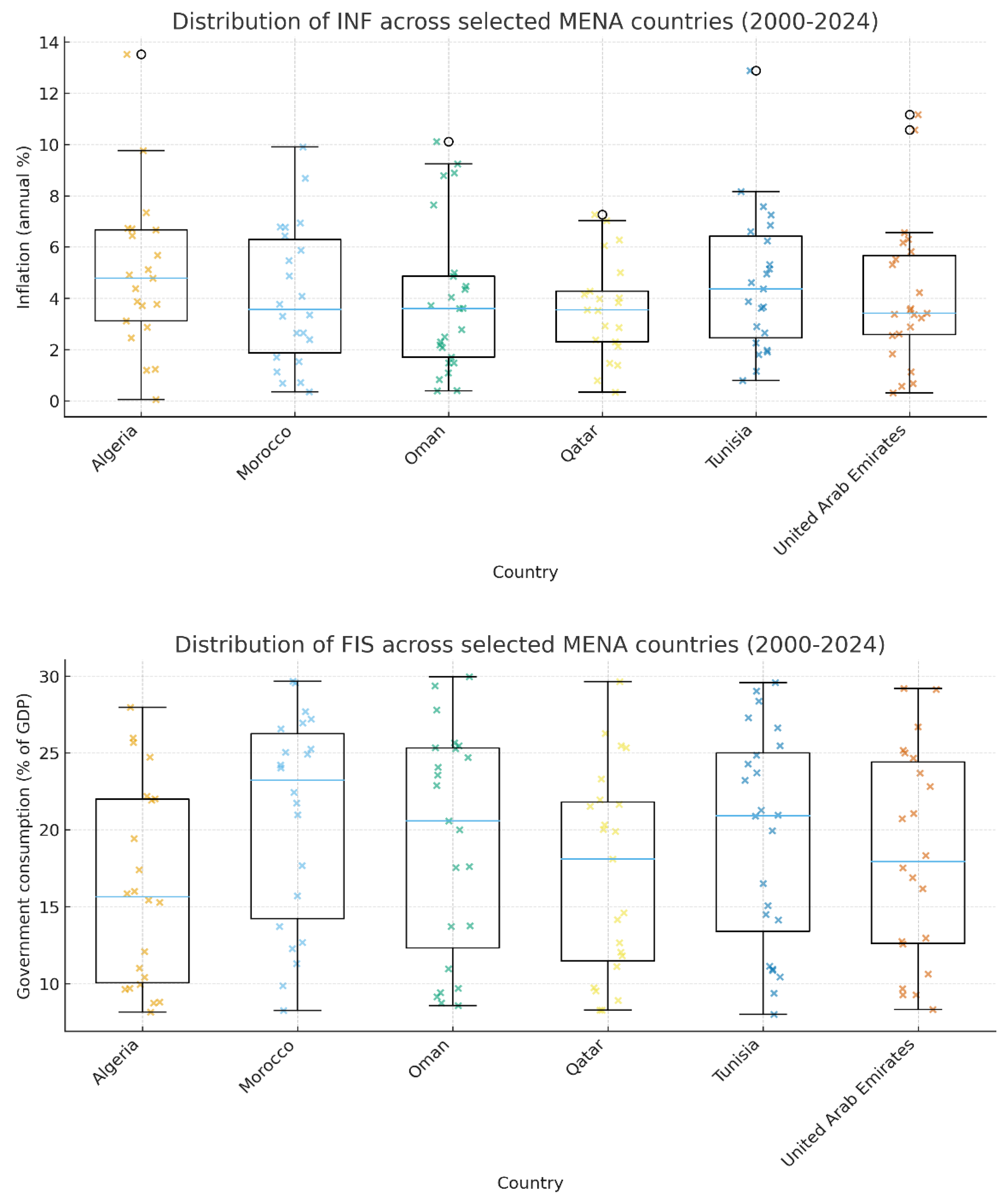 Figure 1 visually illustrate the distributional characteristics of the core variables across the sampled MENA countries. These graphical representations allow for a more intuitive assessment of the data’s shape, central tendency, and cross-country heterogeneity, highlighting features such as skewness, multimodality, and the presence of outliers that are critical for understanding the underlying data structure prior to formal modeling.