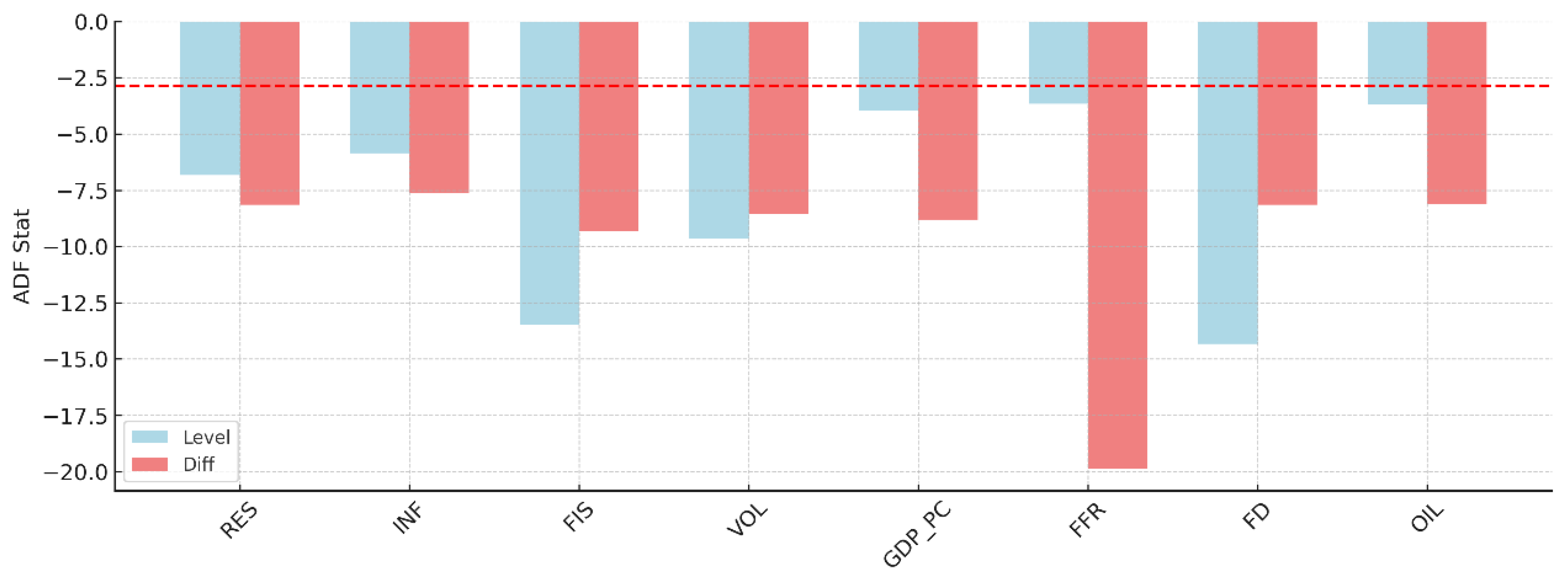 Before performing the econometric analysis, we need to analyze the time-series characteristics of the study variables in order to find their order of integration and to check that subsequent modelling techniques will be suitable. This is done through unit root testing to see if the variables are stationary at their levels or whether they need to be transformed by differencing. The stationarity of the data set is a key requirement in time series econometrics since non-stationary data sets could produce spurious regression results and yield erroneous statistical conclusions. As a result, we applied the Augmented Dickey-Fuller (ADF) test on all study variables both at the level and after the first difference. In addition to this, the ADF test statistics were presented graphically to facilitate straightforward and effective cross-variable comparisons, and visually against their respective critical levels used to evaluate the stationarity of the variable within the test.