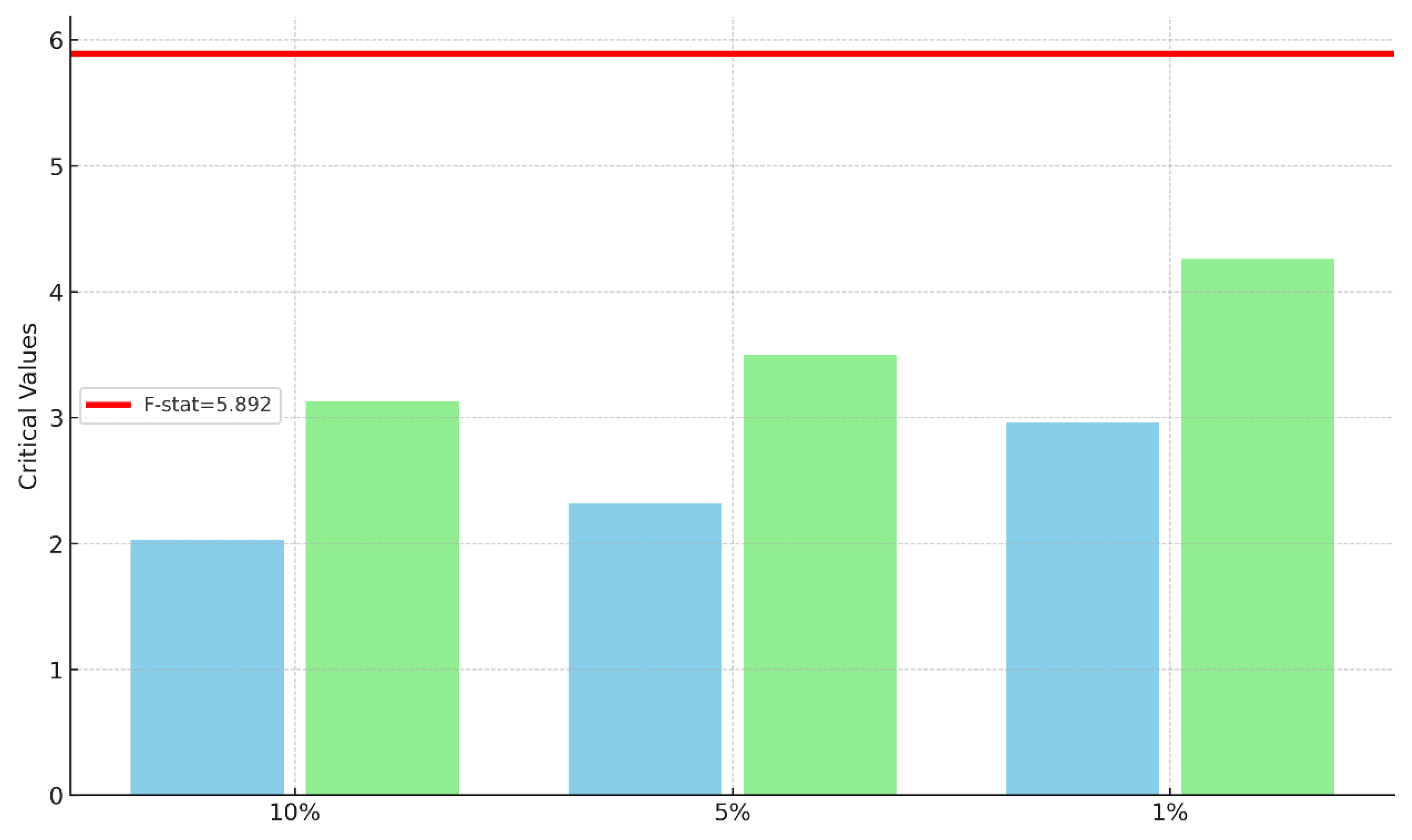 Lower Bound (I(0)) Critical Values—The blue bars display the lower critical value of the F-statistic under the null hypothesis that the regressor(s) are purely stationary (i.e., of order zero, I(0)). In the bounds-testing approach, these values provide a lower threshold below which one fails to reject the null hypothesis of no long-run relationship (i.e., the regressors are strictly I(0)). Thus, the lower bound serves as a conservative benchmark; should the computed F-statistic fall below this value, then the cointegration is not established, independent of the actual integration of the regressors.