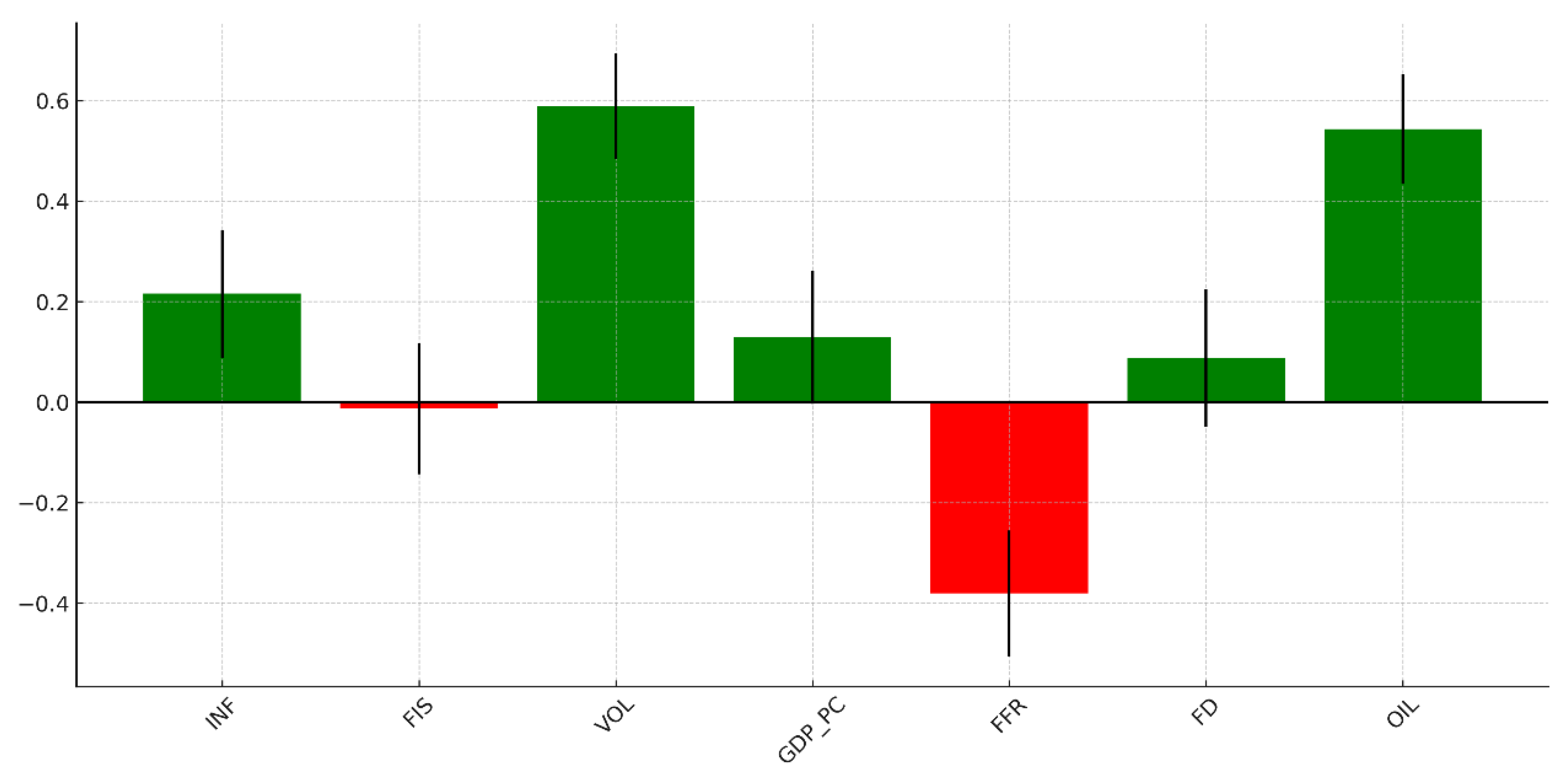 Figure 4 presents the magnitude and statistical significance of each coefficient, offering an intuitive graphical comparison of the relative influence exerted by the macroeconomic determinants and control variables on renewable energy security in the MENA region.