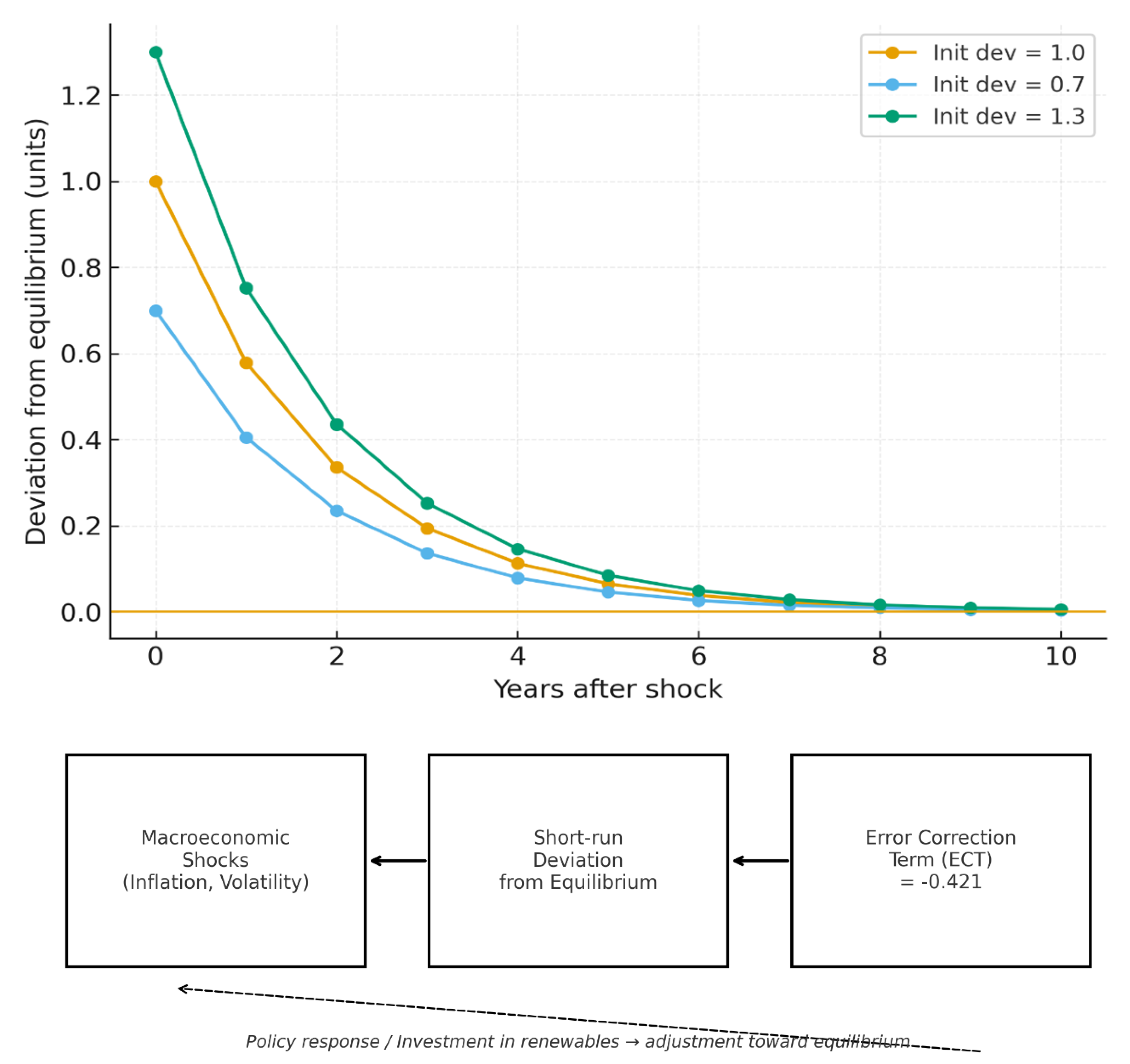 This schematic representation illustrates the dynamic adjustment process. When short-run deviations occur due to macroeconomic shocks, the significant negative ECT ensures that over 40% of the disequilibrium is corrected annually, guiding the system back toward its long-run equilibrium path. The substantial adjustment speed indicates that renewable energy security in MENA countries responds relatively quickly to restore equilibrium relationships following disturbances.