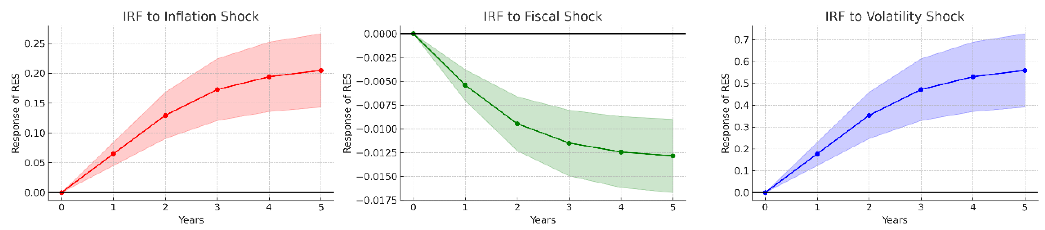 The impulse response functions illustrate the temporal pattern of adjustment. The responses show an immediate reaction in the first period, followed by a gradual convergence toward long-run equilibrium. The patterns confirm that the system is stable and that shocks are absorbed within a reasonable time horizon, typically 3–4 years for full adjustment.
