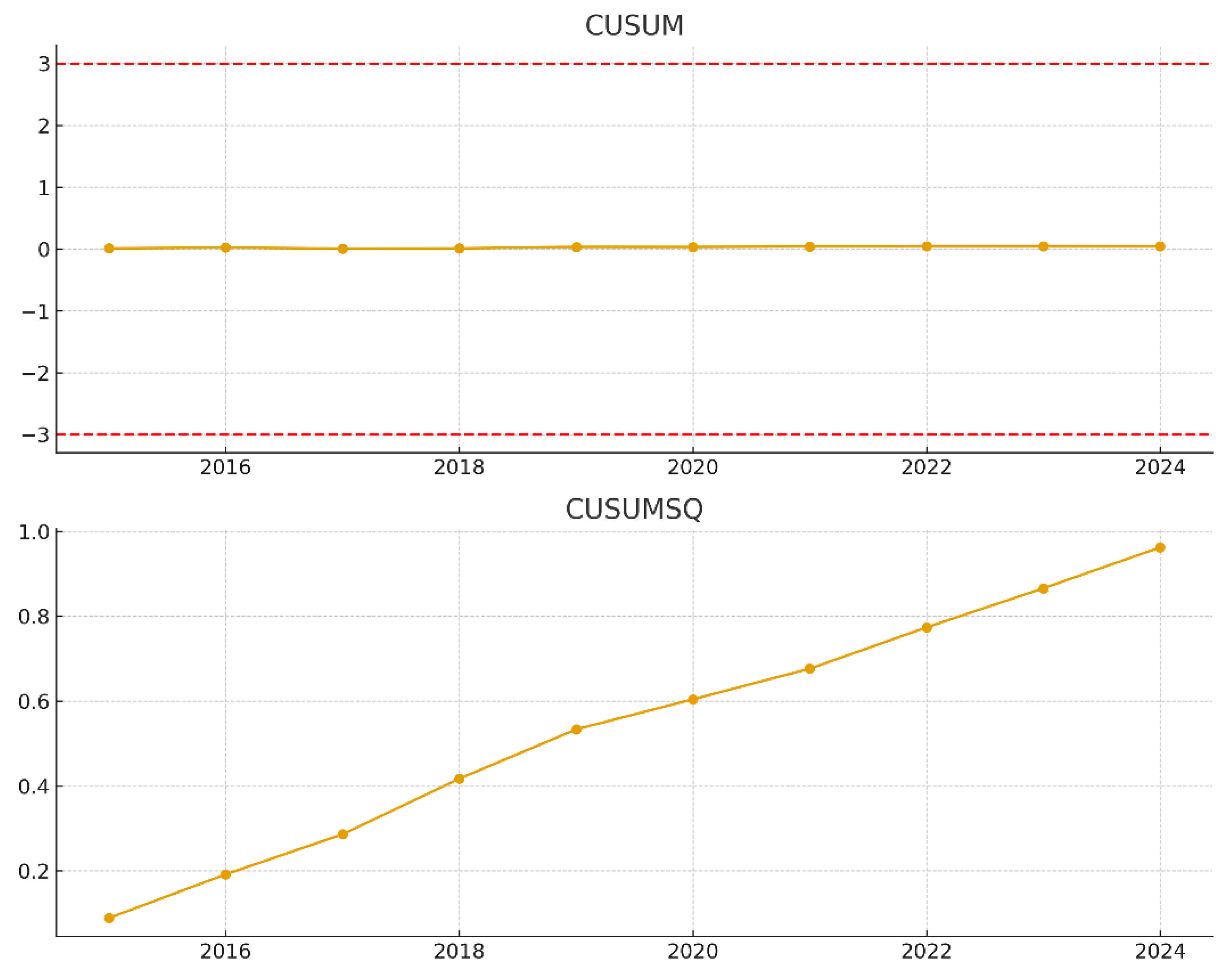 Figure 7, which plots the Cumulative Sum (CUSUM) and Cumulative Sum of Squares (CUSUMSQ) of recursive residuals against time. These tests are crucial for verifying that the model’s coefficients remain stable and that no significant structural breaks are present, thereby reinforcing the reliability of the long-run inferences drawn from the analysis.