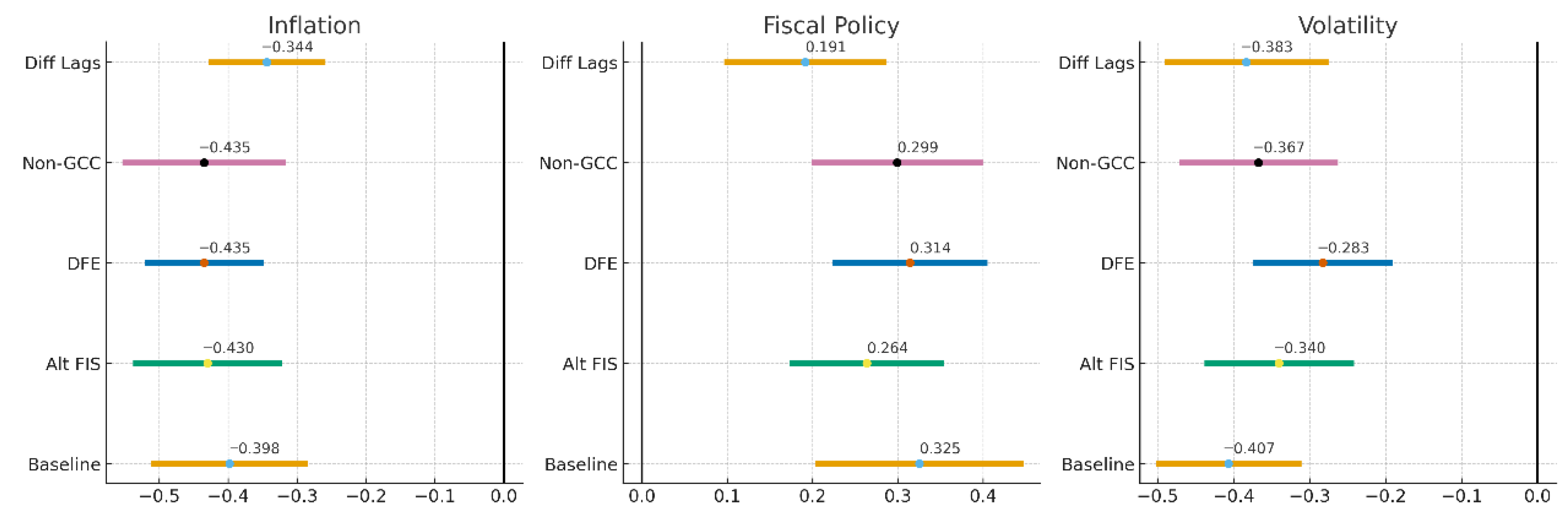 Figure 8 displays the point estimates and confidence intervals of the key macroeconomic determinants across the alternative model specifications. This forest plot allows for a direct, graphical comparison of coefficient stability, demonstrating that the core findings remain consistent and significant irrespective of variations in measurement, sample composition, or estimation technique.