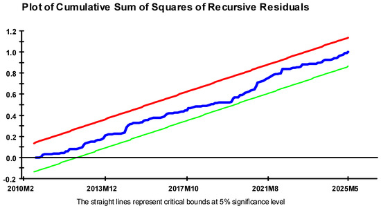 The diagnostic test statistics of the ARDL model to check the validity, stability, and overall fitness of estimated model are presented in Panel C of Table 4. The LM test on serial autocorrelation, which has a value level of 0.5562, is significantly higher than the commonly used thresholds for normal significance. This means that the null hypothesis of no serial correlation cannot be rejected, suggesting that residuals follow a zero-order serially uncorrelated process and the dynamic specification is correct. The Ramsey’s RESET test statistics is 0.4213, which suggests that there is no evidence of model specification error. This finding indicates that the ARDL model functional form is appropriately specified and no crucial nonlinear terms or missed variables exist. The LM heteroscedasticity test results indicate a value of 0.0340 (p-value = 0.854), suggesting that residuals are homoscedastic. This indicates that the error-term variance is constant over time, and that robust standard errors make valid statistical inferences. Furthermore it is observed that Cumulative Sum (CUSUM) and CUSUM of Squares (CUSUMQ) of recursive residuals tests also exhibit stability, which brings evidence that the estimated coefficients are stable at a given sample period without any such breakage (See Figure 1 and Figure 2). Finally, the high adjusted R2 of 0.8909 shows a good explanatory power of the model, suggesting that around 89% of tax revenue variation is explained by the model.