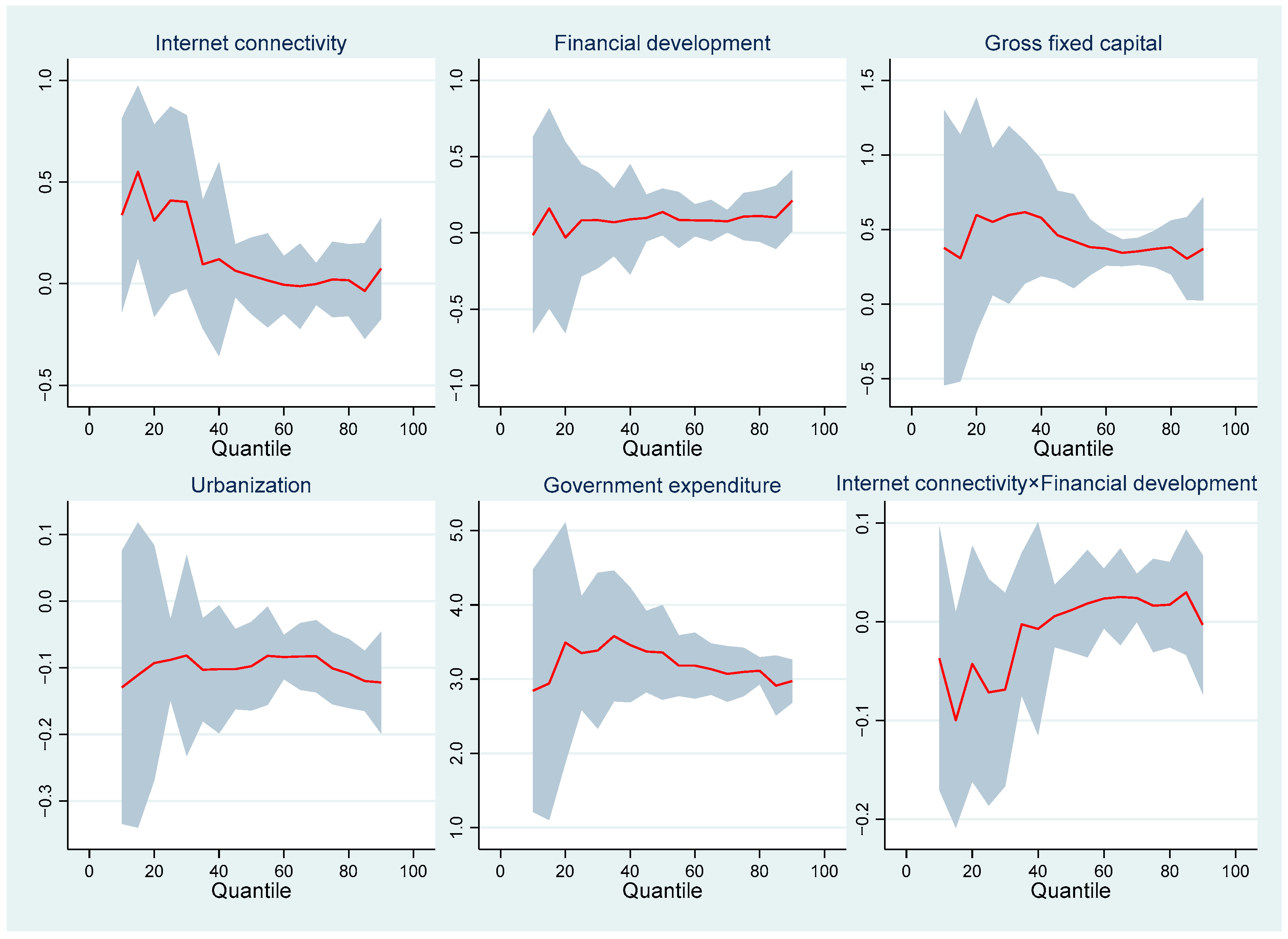Figure 1 reveal notable variation across the conditional growth distribution. Internet connectivity has a consistently positive influence at all quantiles, with the effect particularly strong in the lower-growth regimes. This pattern underscores the importance of digital infrastructure as a mechanism for overcoming productivity bottlenecks in the BRICS economies, helping to ease market frictions, expand information flows, and foster technological adoption where growth remains weakest. Financial development exhibits a more complex and uneven pattern across the distribution. Its coefficient is slightly negative in the lowest quantiles, likely reflecting institutional weaknesses, inefficiencies in credit allocation, or the dominance of informal financial systems in parts of the BRICS region. As growth levels rise, however, the effect turns positive and strengthens, suggesting that financial deepening yields greater benefits in structurally stronger BRICS economies where regulatory quality and financial intermediation are more developed. Gross capital formation also displays its largest positive effect in the lower quantiles, consistent with the idea that investment has higher marginal returns in settings where capital shortages and infrastructure gaps are more pronounced. The strength of this effect gradually moderates as growth improves, mirroring diminishing returns to capital accumulation as economies advance. Urbanization is negatively associated with growth at the lower end of the distribution, reflecting challenges typical of early-stage urban expansion in the BRICS countries—including congestion, pressure on public services, pollution, and inadequately planned settlements. This negative influence becomes less pronounced toward the upper quantiles, indicating that improvements in urban planning, infrastructure development, and governance—particularly evident in China and increasingly in India and Brazil—help unlock the growth-enhancing potential of urbanization over time. Government expenditure shows its strongest positive influence in low-growth quantiles, highlighting its stabilizing and countercyclical role in environments characterized by weaker private-sector activity. As economic conditions improve, the impact of government spending diminishes, which may reflect lower fiscal multipliers or a shift in public expenditure toward activities with less direct growth payoff. The interaction between Internet connectivity and financial development provides an additional layer of insight. The interaction term becomes increasingly positive and statistically significant in the middle and upper segments of the growth distribution. This pattern suggests that the benefits of combining digital infrastructure with inclusive financial systems are most fully realized in BRICS economies that have already achieved higher levels of economic performance. In these settings, digital–financial complementarities promote efficiency, stimulate innovation, strengthen financial access, and support the scaling of digital financial services. In contrast, countries at the lower end of the growth spectrum may struggle to capture these synergies due to institutional constraints, limited digital penetration, or weaker financial infrastructure. Taken together, the MMQR results demonstrate that the determinants of economic growth in the BRICS economies operate differently across the growth distribution. The findings point to the need for differentiated policy approaches that consider each country’s growth position, emphasizing digital and financial complementarities in stronger-performing economies, while focusing on foundational infrastructure, institutional strengthening, and improved urban management in those facing more binding structural constraints.