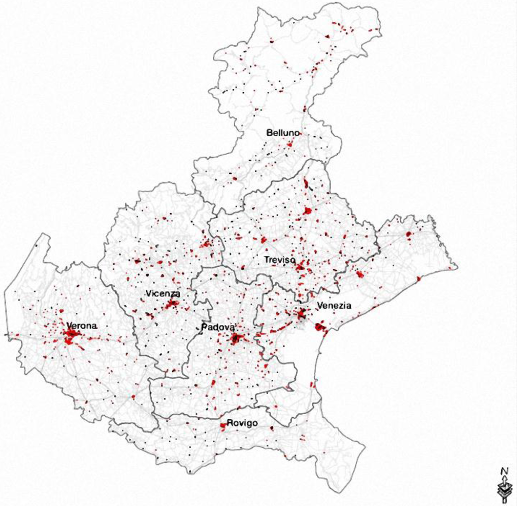 The Cultural Geography of the Veneto Region. Spatial distribution of activities (red points) and facilities (black points).