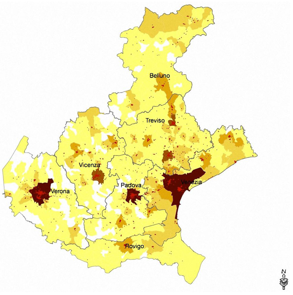 The Veneto Region case is particularly interesting to test the effectiveness of culture in this respect, as it represents a situation of transition from traditional, sector-focused clusters to innovative, innovation-focused ones. In the initial decades of the twenty-first century, the local agents’ attempts to regain a competitive edge have become mandatory once the classical, sector-specific cluster model has been put under pressure due to its poor ability to foster radical innovations rather than small incremental ones. On the other hand, this region is a major example of both an industrial territory and a cultural territory, extremely rich in cultural facilities and activities, so that testing the functional interaction between the two dimensions becomes of special interest, to check whether an innovative, culturally-oriented transformation of an extensive, highly clustered industrial economy rooted mainly in non-cultural fields actually takes place as the theory predicts.