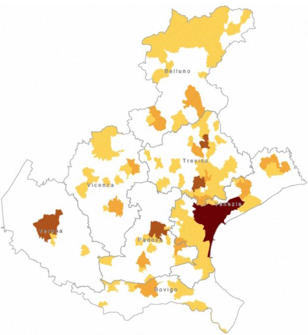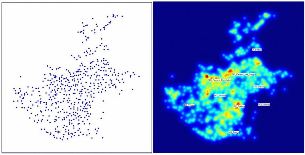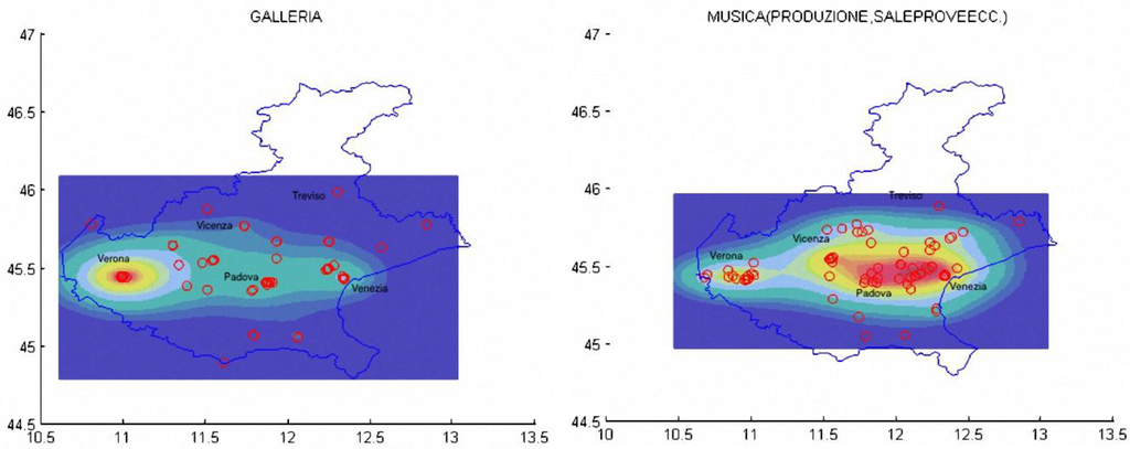Figure 3 shows, for instance, the spatial density pattern for museums, from which, as it could be expected, the predominance of Venice clearly emerges, as does the second-rank order of Padua and (somewhat surprisingly) Conegliano, whereas Verona belongs to third rank (keep in mind that here we are only considering the number of items, not their cultural importance). Likewise,