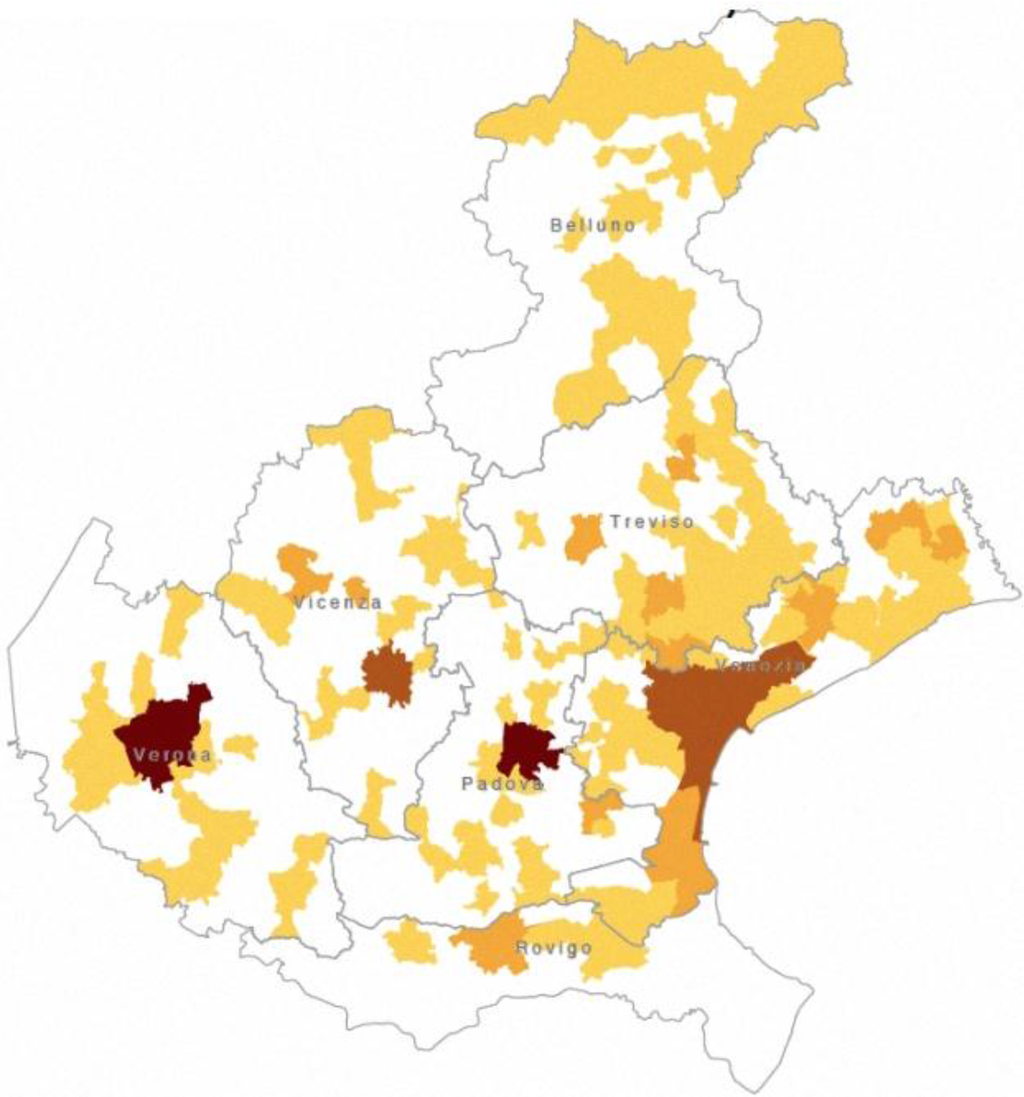 Figure 2 a density map for cultural activities, where darker brown colours denote relatively higher concentration. This new map reinforces the perception of Venice, Padua and Verona as the three main cultural hubs of the Region and the ancillary rank of Vicenza and Treviso; moreover, in the Treviso province, one can notice another hub whose rank is close to that of Vicenza and Treviso, namely, Conegliano. Moreover, several third-rank poles can be found throughout the region, and most notably in the polycentric provinces of Vicenza and Treviso. Through a suitable, sector-specific cluster analysis one can moreover infer different typologies of clusters from the distribution of activities: wide spectrum clusters with a rich and varied profile of activities and facilities, which intersect a large number of sectors and typologies; specialized clusters, mainly focused on specific sectors and lacking of significant presence in others, and non-clusters with a very limited and sparse range of activities and facilities, that do not identify proper territorial concentrations.