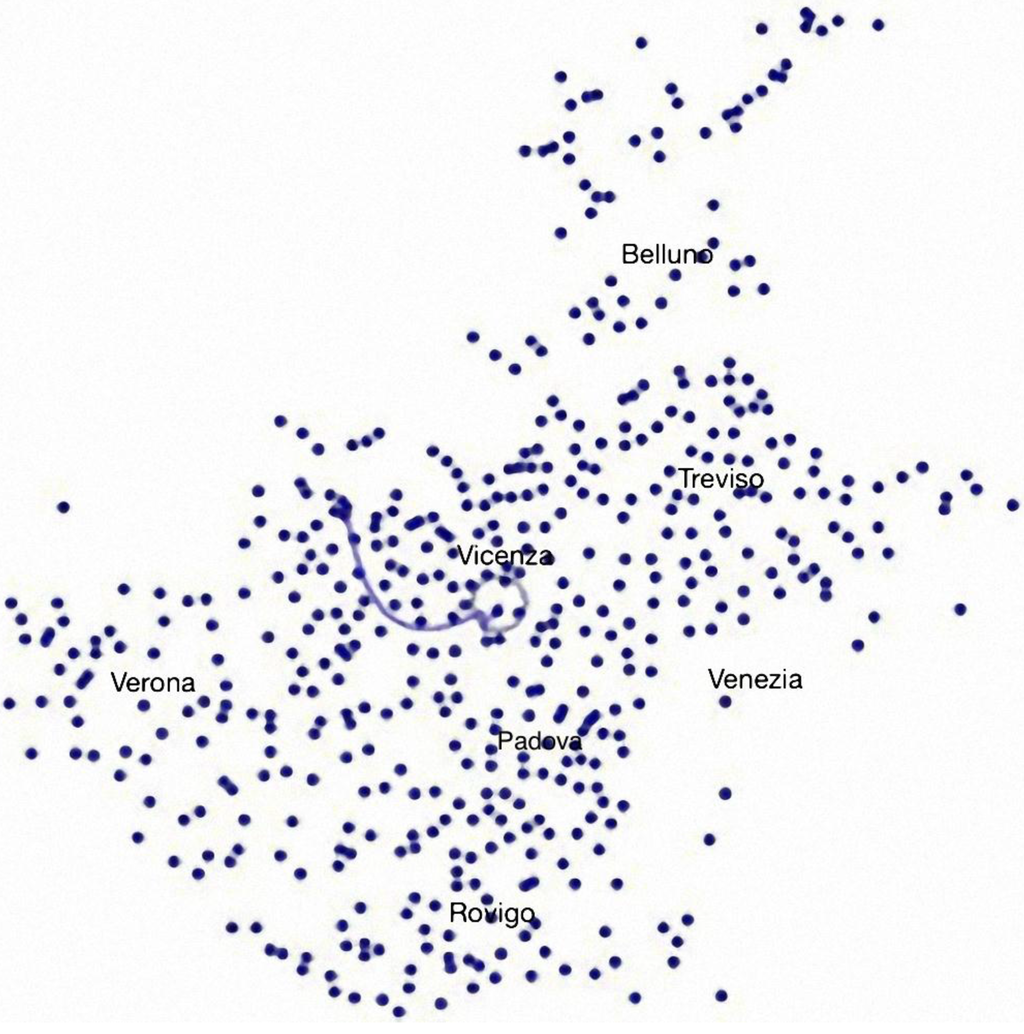 The result is, indeed, quite surprising. Whereas the AC lies, intuitively, close to the geographical center of the region, in the proximity of Vicenza, and close to the intersection of the provinces of Vicenza, Padua, and Treviso, the path toward the TWC moves exactly in the opposite direction with respect to Venice, to land in the middle of the so called Pedemontana area, corresponding to the border between the Northern province of Vicenza and the North-Western province of Treviso, in a mountainous territory which hardly anybody would assume as the cultural hub of the Veneto Region. How is that possible, and what does it mean?