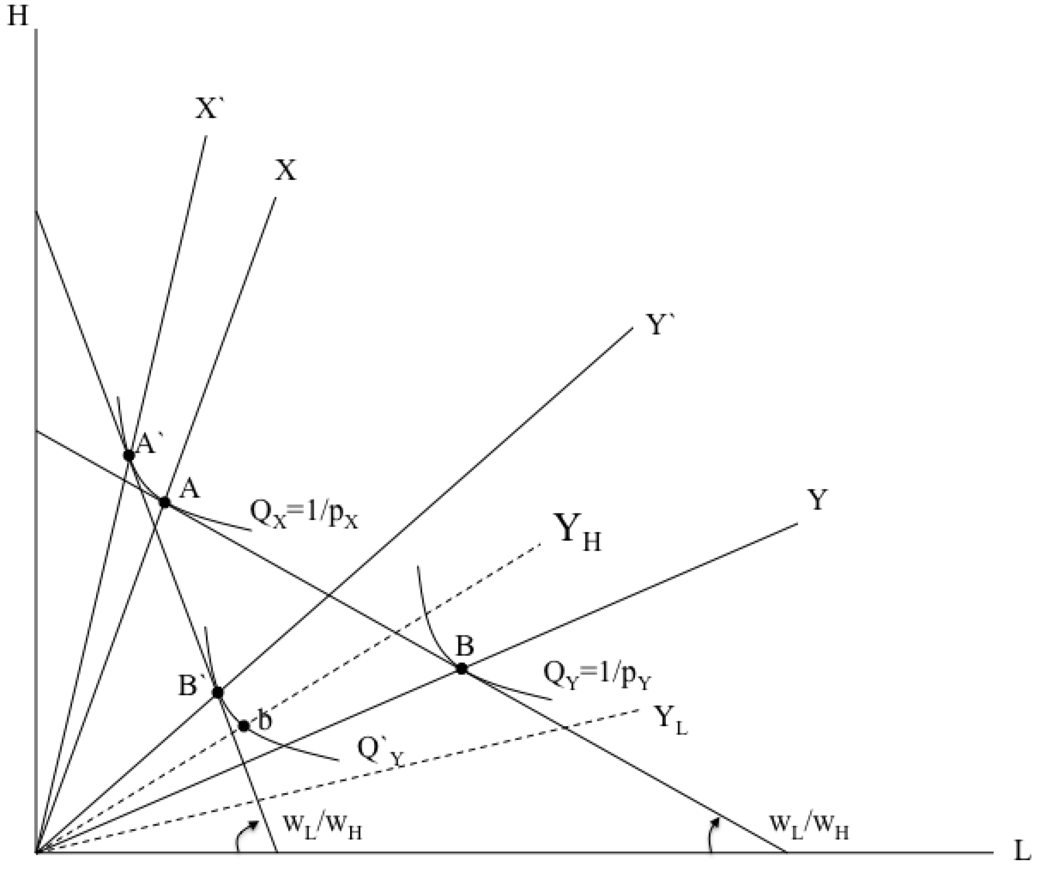 As can be seen in this Pearce-Lerner diagram (with high-skilled labor (H) on the vertical and low-skilled labor (L) on the horizontal axis), there exist two industries, the relative high-skill intensive industry (X) and the relative low-skill intensive one (Y). The factor intensities are given by the two expansion paths X and Y. At the initial equilibrium, production takes place at points A and B, where the unit value isoquants Q interact with the relative price line . The Y industry produces at point B with the use of two intermediate products (relative high-skill intensive) and (relative low-skill intensive).
