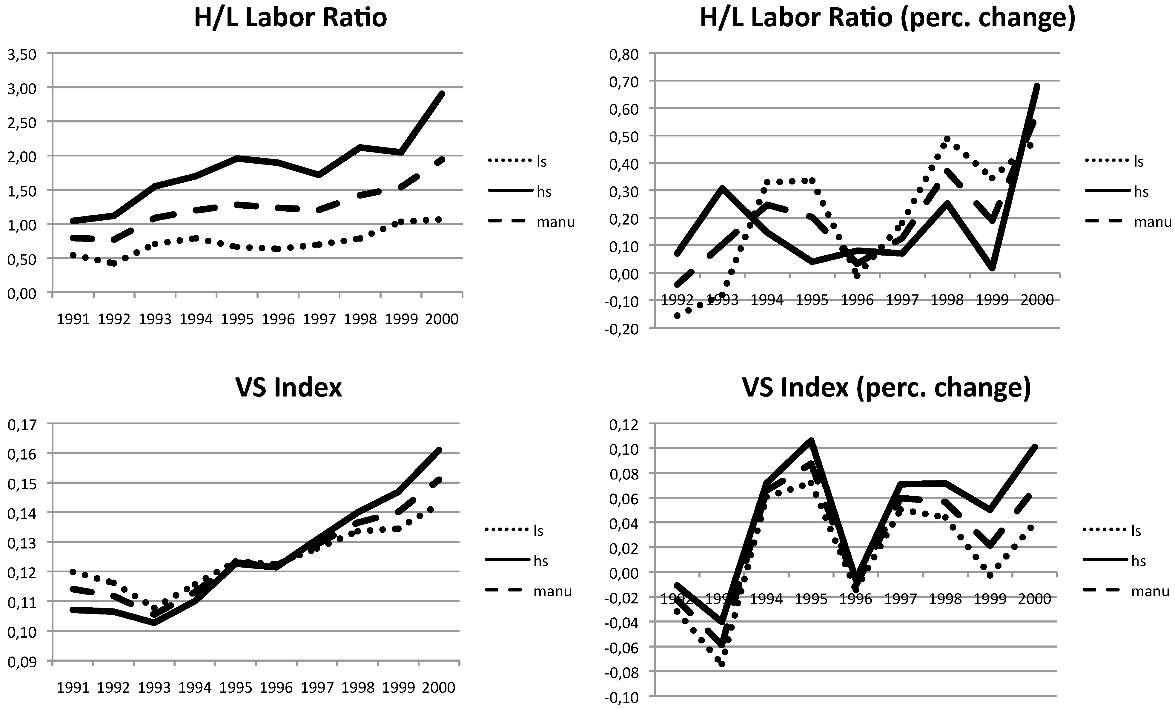 As expected for developed economies, the figure shows a skill upgrading effect in the German manufacturing industry. The growth rate of the ratio, however, is fluctuating over the years. In addition, offshoring activities (the VS-index) increase over the considered time period. While fluctuating in the first years from 1991–1995, a strong increase occurred after 1995. When examining the development of the VS-index in greater detail, we observe that in Germany offshoring is more pronounced in the relative high-skill intensive industries than in the relative low-skill intensive ones.11 As shown in Falzoni and Tajoli (2012), this pattern is similar than the offshoring activities in Italy [24].