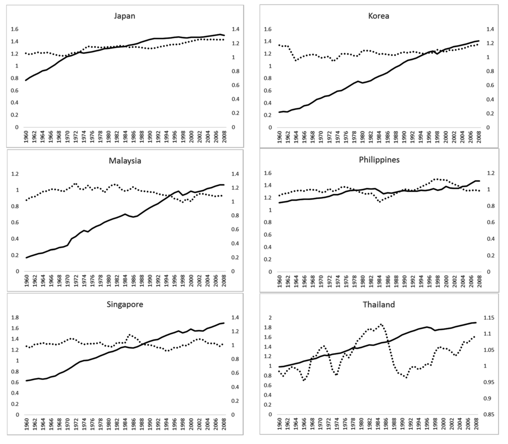 Our motivation for adding to the extensive literature on the topic has three main components. First, as the listing by Durevall and Henrekson (2011) [1] shows, there are numerous studies that looked at a single country (e.g., Bangladesh, Canada, China, Fiji Islands, Germany, Greece, Iraq, Kuwait, Mexico, Portugal, South Africa, Sweden, Taiwan, Turkey, U.K. and U.S.A.). There are also many studies that considered various groups of countries, including the EU, G7, OECD, Caribbean region, West African Monetary Zone, and large segments of the developing world1. However, there seems hardly any research on the topic relative to East Asia where economic growth has been high during the last 50 years and which thus seems to be a prime candidate for exploration of the hypothesis. Thus, to close this gap, we examine the validity of Wagner’s proposition for six major East Asian economies—Japan, Korea (south), Malaysia, Philippines, Singapore and Thailand. Second, the annual data used in this study cover the half-century period from 1960 to 2008, which is probably longer than that covered in almost any single-country study from the developing world. Except for the Philippines, the countries have experienced high rates of economic growth over the period, which have often been perceived as a “miracle”. It should be easier to observe Wagner’s proposition in these high growth countries than in most other contexts where growth rates have been less rapid. Third, the validity of the Wagner’s law is examined using both time-series and panel cointegration tests.