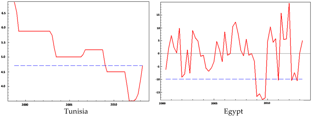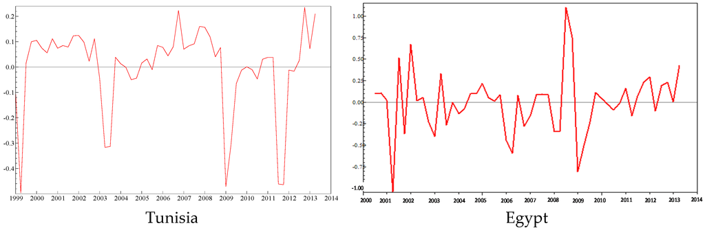 Inspection of the residuals series obtained from the estimation of the linear Taylor rule (Figure 2) reveals that the rule seems to capture the behavior of decision makers for both Tunisia and Egypt well. However, it is interesting to note that there are large residual spikes for more than one period notably in 1999–2000, 2003–2004, 2009 and 2011:Q4 for Tunisia and in 2001–2002, 2008–2009, 2011 and 2013 for Egypt. The fitted interest rate is, over these time intervals, correlated and remarkably different from the actual value.