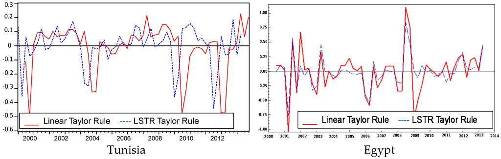 In order to better appreciate the gain in terms of fit obtained by leaving the linear rule for the nonlinear specification we plot in Figure 3 both the residuals from the augmented linear Taylor rule and the nonlinear specification. We notice that allowing for the functional form to deviate from a constant parameter Taylor rule allows good description of the broad contours of Tunisian and Egyptian monetary policy conduct especially in periods of special regime and reveals less autocorrelation of the residuals. Indeed, such special regimes refer to some special circumstances in which policy makers extensively use their judgment to make decisions.