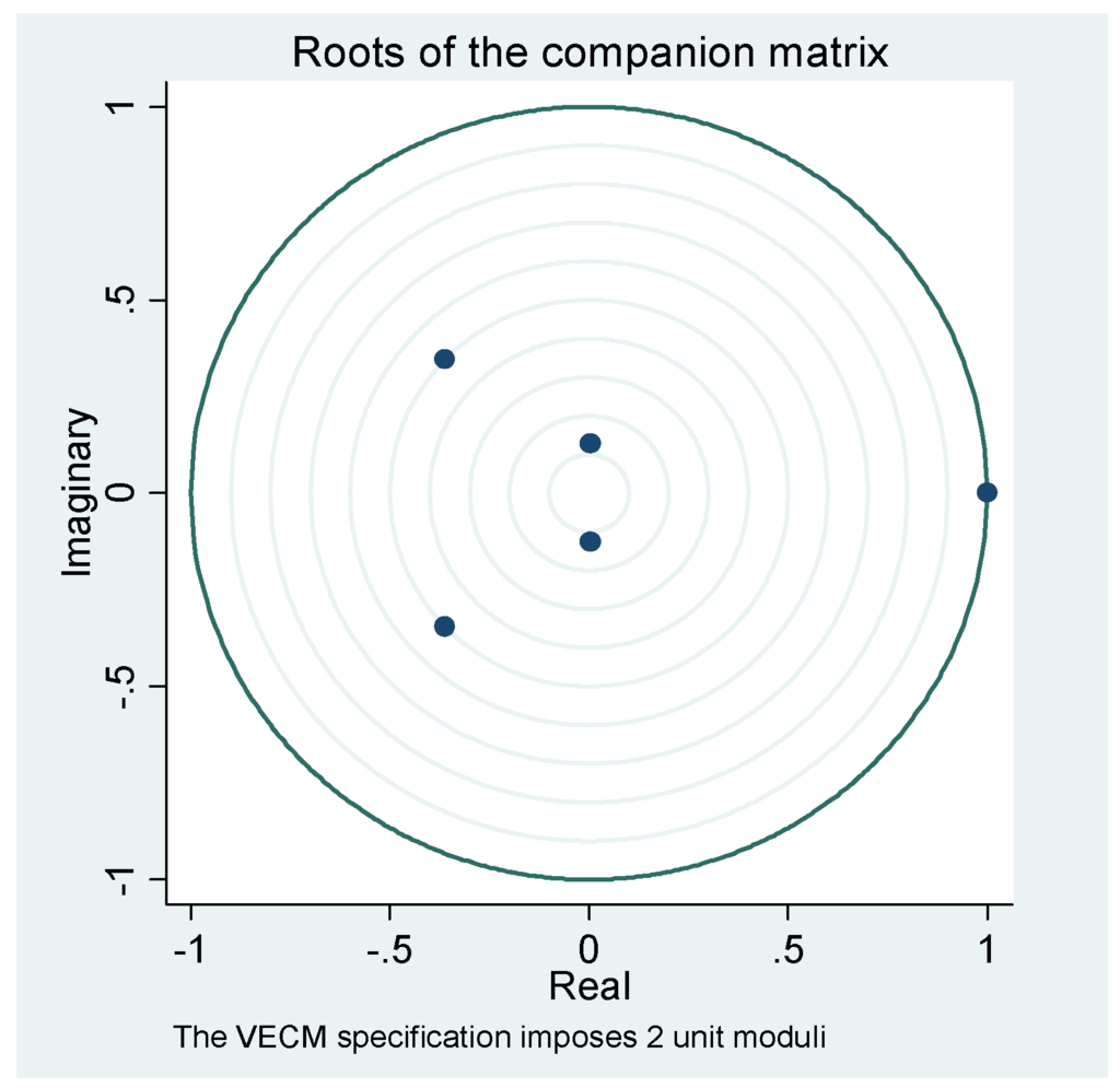 A stability result test with Eigenvalue showed that the system was stable. This showed that the VECM were desirable (