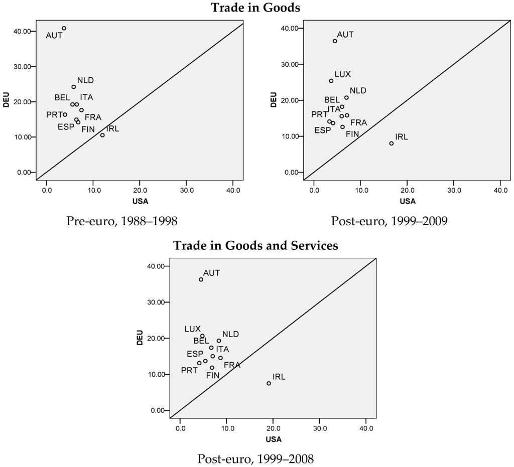 Figure 1 for pre- and post-euro periods. Countries located on the upper-left from the diagonal line are more intensely related to Germany, whereas those located on the lower-right are more closely linked with US. The first two plots pertain to trade in goods only while the third plot pertains to trade in goods and services whose data are available only for post-euro period.