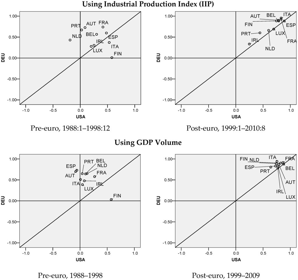 From the pre-euro findings using IIP, it is evident that synchronicity with Germany is predominant in which eight of the 10 states are much closer to Germany than to US, and a rather scattered configuration can be seen