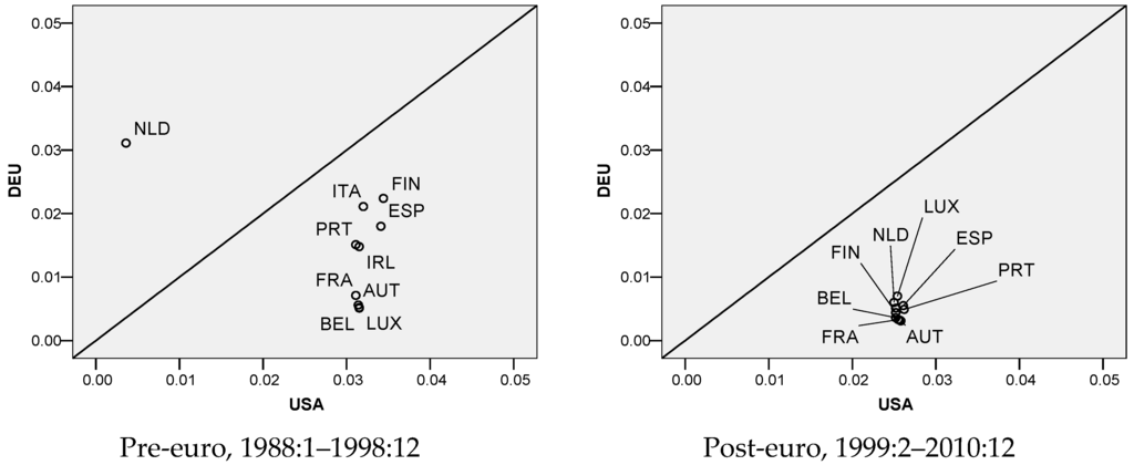 Figure 3 displays the plots where real exchange rate variabilities with Germany are plotted against those with US. There are about three clusters in the pre-euro setting. First is the Netherlands, which is uniquely a lot more variable against Germany than against US. Amongst those that are more variable with US, there seems to be a tight cluster consisting of France, Austria, Belgium, and Luxembourg, which is more stable against Germany, and a loose collection of Italy, Finland, Spain, Ireland, and Portugal.