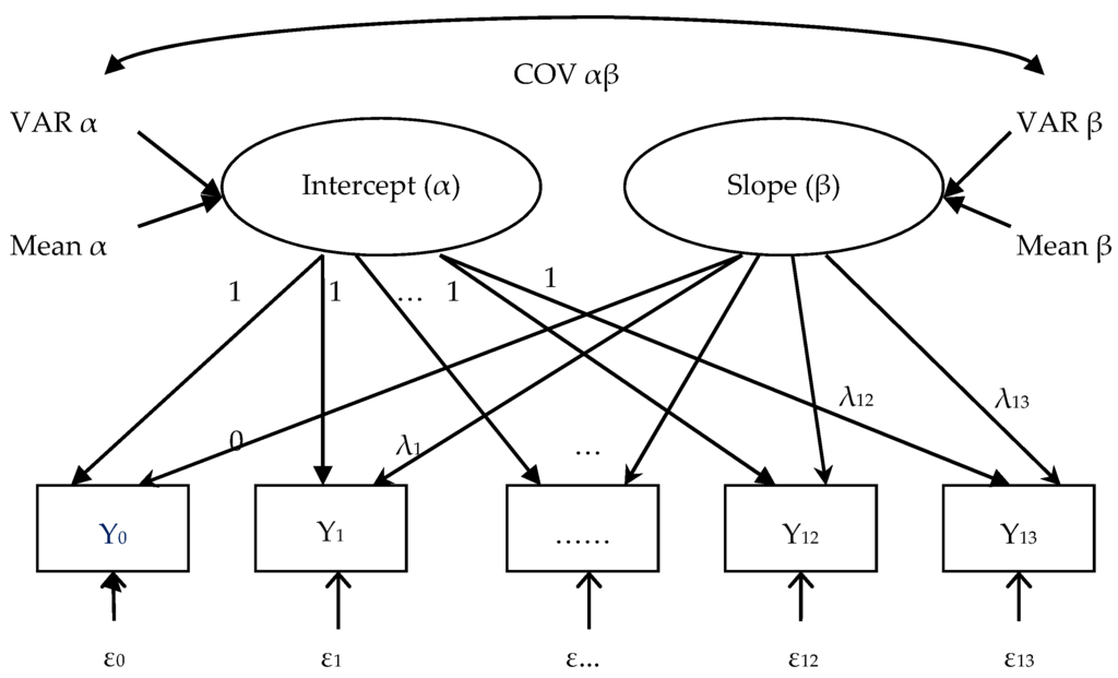 - G.R. Hancock, and J. Choi. “A vernacular for Linear Latent Growth Models.” Struct. Equ. Model. 13 (2006): 352–377. [Google Scholar] [CrossRef]