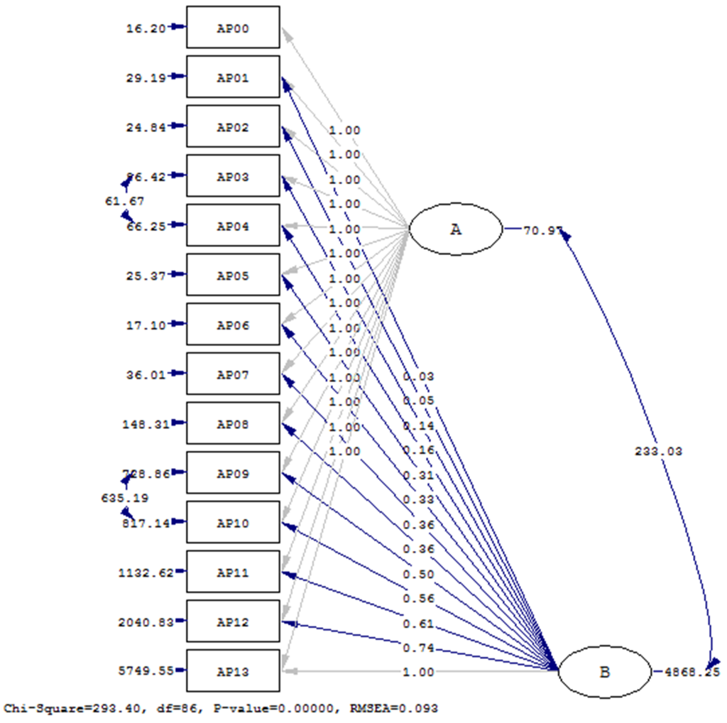 This study starts with an explorative strategy hypothesizing an unspecified curve trajectory as a reflection of free-estimated factor loadings (Bollen and Curran, 2006 [19]) on the dataset. For the sake of brevity, we only present the unspecified curve unstandardized estimates with free estimated factor loadings with constraining λ00 = 0 and λ13 = 1 and freeing errors between AP03 and AP04 and between AP09 and AP10 6 (see Figure 2, where AP stands for the agricultural labor productivity Y).