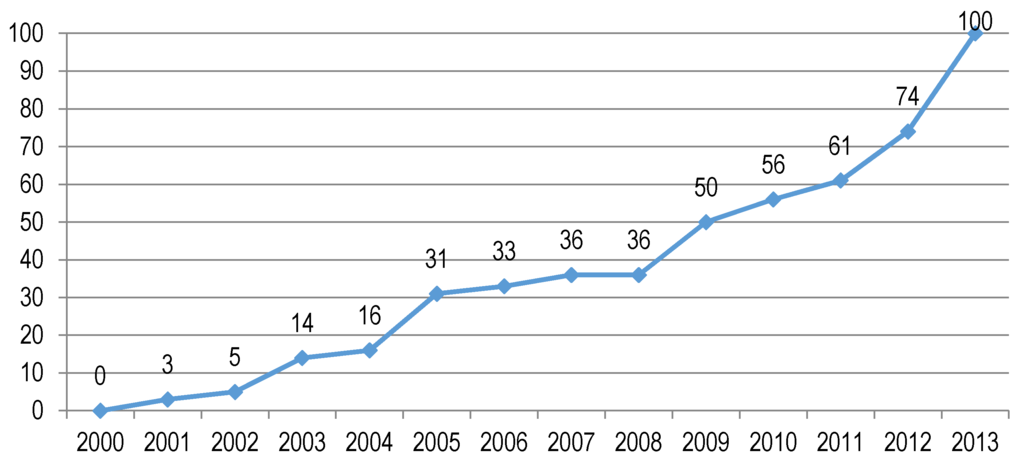 The free loadings signify the cumulative proportions of change of agricultural labor productivity occurring from the first year (2000) to the last year (2010). We can get the cumulative proportions of total change across the time period. It is indicated that 3% of the total change in agricultural labor productivity occurred between 2000 and 2001; 5% of the total change in agricultural labor productivity occurred between 2000 and 2002; 14% of the total change in agricultural labor productivity occurred between 2000 and 2003, and so forth. Figure 3 shows the trend of changing rates during 2000–2013. It is actually noteworthy that the trend of changing rates increases too rapidly to be a linear curve. The changing rates are fluctuant, in other words, the agricultural labor productivity increases faster in some years, while it gets slower in some other years. Several dramatic increases happened during the period, putting forward our initial idea to further explore about what type of exogenous factors might spur the sharp increases to result in a discontinued piecewise trend.