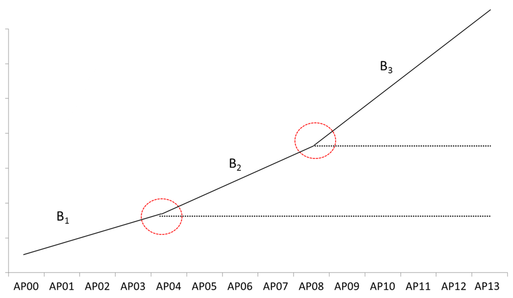 Finally, a piecewise linear LGCM (Bollen and Curran, 2006 [19]) is hypothesized as an alternative strategy for dealing with non-linear trends. We determine two breaking points by examining the unspecified curve unstandardized estimates and error covariance (see Appendix B). One is the national agricultural subsidy reform in 2004, and the other is the 2008–2009 Chinese economic stimulus plan (the “4-Trillion-Yuan Stimulus Package”, see the article in China Daily). Hence, this model can be postulated based on a piecewise strategy setting 2004 and 2008 as breaking points 5, which divide the whole trend into three parts represented by three linear slopes β1, β2 and β3. The function can be expressed with freezing the loadings in the level of growth at the time points of 2004 and 2008 that respectively constitutes a new point of departure for the second growth factor β2 and the third factor β3. The function is as follows: