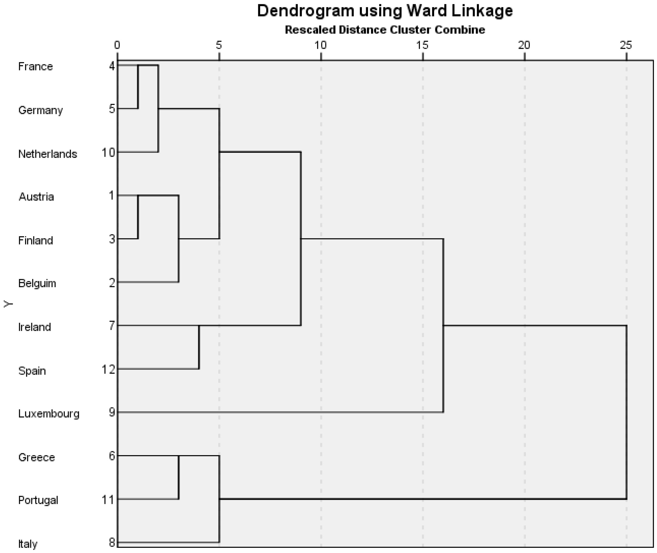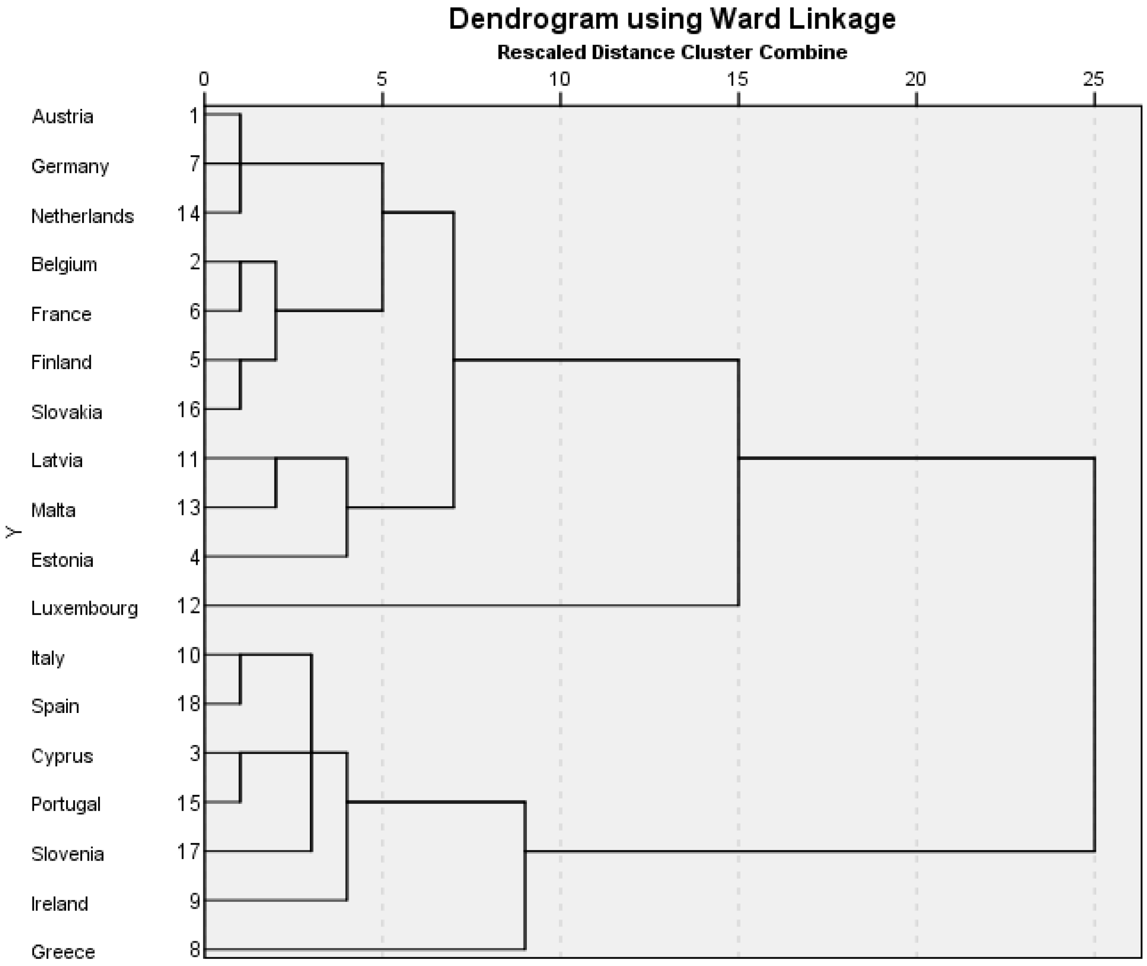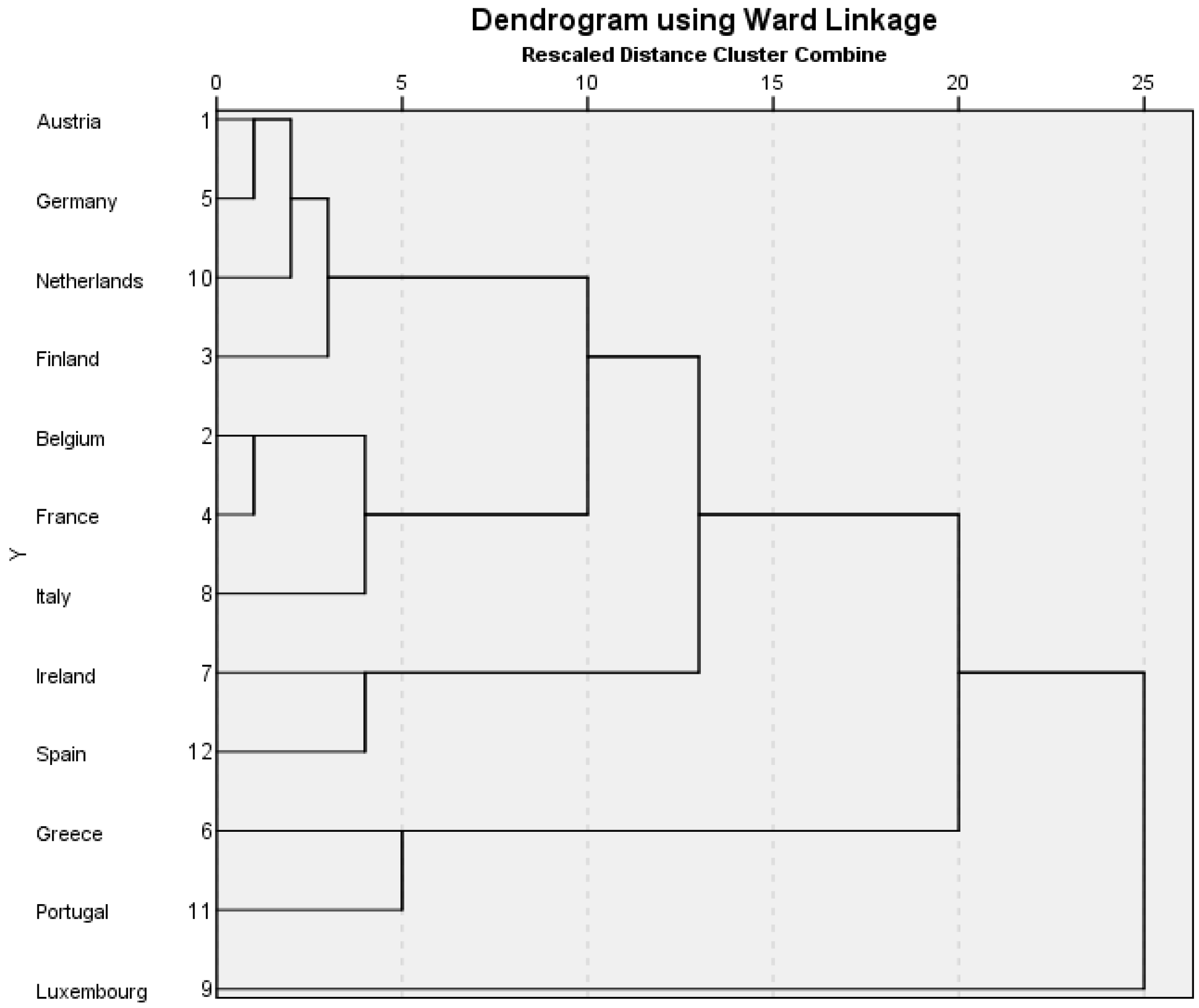 The clustering method used is Ward’s linkage. This calculation reduces the minimum variance within clusters by joining cases into clusters that result in the smallest increase in the Error Sum of Squares (ESS). It is known that different mathematical clustering methods can produce different cluster results (Aldenderfer and Bashfield, 1984 [26]; Pastor, 2010 [27]). Ward’s linkage is argued to be the most stable clustering proximity method for this research study because of its tendency to produce tight and closely related clusters in the first stage of the hierarchical analysis. In this study it is less likely to produce mathematical artefacts without real substantive meaning that are based on chance relationships in the data. Also, in this study, the sample size is small and the main research interest is in the first clusters formed in the analysis, rather than the subsequent combinations of clusters in the hierarchy. Input variables are standardised to z scores to reduce the impact of any variable with a greater variance having more impact on the model. Cluster results are presented in figures called dendrograms. A dendrogram is a branching diagram that shows the similarities amongst a group of cases. The horizontal scale is defined by SPSS as the ‘rescaled distance cluster combine’, so the higher the joining nodes on the combining scale, the less similar the countries are.
